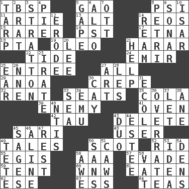 ACROSS 1. Cook's measure (abbr.) 5. E Mali city 8. Air pressure measure (abbr.) 11. Nick name for Arthur 13. The first octave above the treble staff 14. Vintage cars 15. More uncommon 16. Pacific Standard Time (abbr.) 17. Inactive volcano in Sicily 18. Parent Teacher Assoc. 19. Margarine 21. Ethiopian city, capital of Harari 22. Periodic rise and fall of the sea level 24. Independent ruler or chieftain 25. Main course 27. Everything 29. Small Philippine buffalo 30. Streamer paper 32. Monthly bill 33. Theater features 35. Root beer relative 39. Foe 41. Baking chamber 42. The 19th letter of the Greek alphabet 43. Erase 45. Indian skirt 48. One who uses or employs something 49. Stories 50. Highlander 52. To free from 55. Armor plate that protects the chest 56. American Automobile Association (abbr.) 57. Dodge 59. Portable shelter 60. Compass dir. 61. Eroded 62. Compass dir. 63. Curvy letter 64. Afternoon social gatherings DOWN 1. Canvas cover 2. Naughty child 3. Ski resort town in Vermont 4. Sliced dessert 5. Yawn 6. In addition 7. Baseball player Mel 8. _ dish (used to culture cells) 9. Underwater navigation system 10. Austrian river, tributary to the Danube 12. Eat (away) 14. 480, 500 or 516 sheets of paper 20. Area sheltered from the wind 21. Assist 23. Feeling or showing extreme anger 25. Hearing organ 26. Compass dir. 27. Tate display 28. French article 30. Island 31. Learning spot: Fr. 33. Ocean 34. Australian flightless bird 36. Make much ado about nothing 37. Allow 38. A saturated hydrocarbon 40. Nuclear Threat Initiatives 43. Superhero pair 44. First name in cosmetics 45. Gurus 46. Place in a line 47. State of inaction 49. Wig 50. Without 51. Crow sounds 53. It may be bright or harebrained 54. Hiding places for outlaws 56. Deep reverence 58. Large container