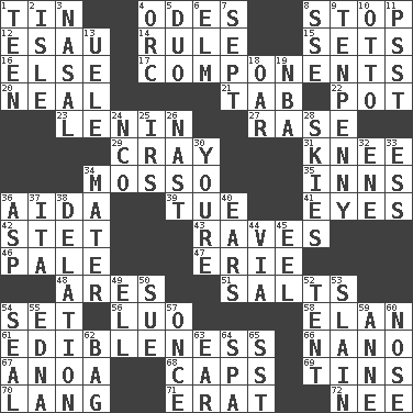 ACROSS 1. Shallow baking pan 4. Lyric poems 8. Close up, plug up 12. Son of Isaac 14. Governing power 15. Puts into a specified state 16. Otherwise 17. Pieces 20. Actress Patricia 21. Keyboard key 22. Cooking vessel 23. Soviet premier 1918-24 27. Raze (variant) 29. Supercomputer manufacturer 31. Leg joint 34. With motion or animation 35. Taverns 36. Opera by Verdi 39. Third day of the wk. 41. Snake ____ (dice throw) 42. Proofreading order 43. All-night dance parties 46. Diluted with white 47. One of the Great Lakes 48. Ancient Greek god of war 51. Table seasonings 54. Put into a specified state 56. Nilotic language 58. Style 61. The property of being fit to eat 66. Billionth: prefix 67. Small Philippine buffalo 68. Smile enhancers 69. Canisters 70. Austrian-born American filmmaker Fritz 71. Part of Q.E.F. 72. Born DOWN 1. Adolescent 2. Small island 3. Relating to the nose 4. The grampus (Milton) 5. Superhero pair 6. Shade tree 7. Back-to-school mo. 8. Compass dir. 9. 3-inch nail 10. Von Bismarck 11. Inconspicuous attention getter 13. Ubangi River tributary 18. Rowing implement 19. Basketball assoc. 24. Non-commissioned officer (abbr.) 25. Big collection agency 26. Political cartoonist Thomas 28. Atmospheres 30. You are 32. Compass dir. 33. Curvy letter 34. Mother 36. Cleo's killer 37. Call ___ day 38. Accusation by an informer 40. Hearing organs 44. By way of 45. Snakelike fish 49. Pipe bend 50. Institute legal proceedings 52. Portable shelter 53. Killed 54. Lick closed 55. Pulitzer Prize-winning author Ferber 57. At one time in the past 59. Singer Murray 60. Sense of smell 62. Container for groceries 63. Hearing organ 64. Health resort 65. Fast jet (abbr.)
