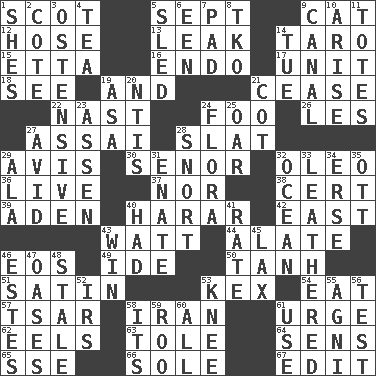 ACROSS 1. Native of Scotland 5. Back-to-school mo. 9. Feline 12. Stockings 13. Path through which fluid escapes 14. Pacific island yam 15. Singer James 16. Inside; within (prefix) 17. A single undivided whole 18. Perceive with the eye 19. Also 21. Desist 22. Political cartoonist Thomas 24. Egg _ yung 26. French article 27. Slender Brazilian palm 28. Narrow board 29. Deliberation 30. Sir (Sp.) 32. Margarine 36. Not recorded 37. Or not 38. Foregone conclusion 39. Arabian gulf 40. Ethiopian city, capital of Harari 42. Compass direction 43. Electrical Unit 44. Having winglike extensions 46. Greek goddess of the dawn 49. Binary compound 50. Hyperbolic tangent 51. Smooth fabric 53. A weed 54. Ingest 57. Russian ruler of old 58. SW Asia republic 61. Goad 62. Snakelike fish 63. Lacquered or enameled metalware 64. Elected reps. 65. Compass dir. 66. Not divided or shared with others 67. Prepare for publication DOWN 1. "______ My Girl" (Turtles hit) 2. ____ d'Azur (French Riviera) 3. Clearly or manifestly demonstrative 4. Beverage made from leaves 5. Downhill vehicle 6. Car or cant ending 7. Groovy apt. 8. Ring climax 9. Lessep's creation 10. Originate 11. Hauls 14. Third day of the wk. 19. White ___ sheet 20. Nuclear Threat Initiatives 21. Small bed 23. NE Netherlands city 24. Plants 25. Rowing implement 27. Enthusiastic 28. Derisive sound 29. Wing 31. Related on the mother's side 32. Sea 33. Tough but pliablecoriaceous 34. Celtic language 35. Baseball player Mel 40. Possessed 41. Pace 43. Acquire through effort 45. Not strict 46. _____ Park, CO 47. Fertile tracts in a desert 48. Having lost freshness 52. Big collection agency 53. Leg joint 55. Hindu god of fire 56. Trial 58. It is 59. Friend of Pooh 60. Everything 61. Purpose