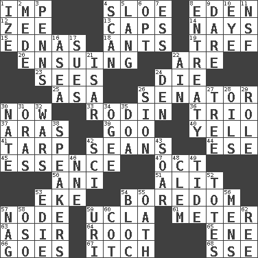 ACROSS 1. Mischievous child 4. A type of plum 8. Genesis locale 12. Last letter of the English alphabet 13. Smile enhancers 14. Negative votes 15. Ferber et al. 18. Pismires 19. Unclean, religiously 20. Following as a consequence or result 22. "We ___ not amused" (Victoria) 23. Perceives with the eye 24. Pass on 25. White ___ sheet 26. Legislator 30. At this time 33. "The Thinker" sculptor 36. Musical group of three 37. Caspian sea tributary 39. Thick or sticky substance 40. Shout 41. Canvas cover 42. Actors Connery and Penn 44. Compass dir. 45. Substance 47. Sep. follower 50. Black tropical American cuckoo 51. Came down and settled, as after flight 53. Make supply last 54. Mood resulting from idleness 57. Connecting point 59. Southern CA. univ. 61. Distance measurement 63. SW Saudi Arabia district 64. Carrot, for example 65. Compass dir. 66. Moves 67. Hankering 68. Compass dir. DOWN 1. Ending with capital 2. Ancient Persian 3. Actor Sean's family 4. Glance over 5. Austrian-born American filmmaker Fritz 6. Elect 7. Curvy letter 8. Plea 9. Have the gumption 10. Sight organ 11. Science/research agcy. 16. At sea 17. Institutes legal proceedings 21. Austrian river, tributary to the Danube 22. The 18th letter of the Arabic alphabet 24. Lair 26. The Jewish people; Israel 27. Relationship diagram 28. Lubricates 29. Hero or heavy, e.g. 30. Nathan's nickname 31. Mouths or openings 32. Armed conflicts 34. Double curve, resembling the letter S 35. ___ good deed 38. Orators 42. _-fi 43. Fly high 46. Compass dir. 48. Clement's nick name 49. Event that recurs at intervals 52. Hauls 53. Singer Brickell 54. Alliance 55. Pledge 56. Not women's 57. Tired old horse 58. Bear (Spanish) 59. RI univ. 60. Small bed 62. To sift