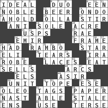 ACROSS 1. Standard of perfection 6. Superhero pair 9. Car or cant ending 12. Having high moral qualities 13. Fermented drink made from hops 14. Southwest Nigerian state 15. Hold, grip (Informal) 16. Water jar 17. Disorderly outburst 18. Black tropical American cuckoo 19. Flatfish 20. Land measure 21. United States Postal Service (abbr.) 23. Actress Charlotte 24. Independent ruler or chieftain 25. Movie unit 28. Possessed 30. Role for Stallone 34. Play the lead 35. Connecticut Ivy Leaguer 36. Pulls apart 38. Lyricist Gershwin 39. Loose flowing garment 41. Shoestrings 43. Erode 44. Exchanges for money 46. Curves 48. Raised railways 49. SW Saudi Arabia district 50. A single undivided whole 51. Drink excessively 53. Compass dir. 56. Butter sub 57. Labels 58. Some stationery 60. Political cartoonist Thomas 61. Competent 62. Showing deterioration from age 63. Followers of ems 64. Purpose 65. Laconic DOWN 1. _ tizzy (2 wds.) 2. Capital of the state of Qatar 3. Inky black, to poets 4. Plant genus of onion and garlic 5. Directed 6. Small valley 7. Ubangi River tributary 8. Mouth or opening 9. Pleas 10. Singer Brickell 11. Not either 13. Scornful sounds 14. Motion picture awards 19. Small fatty European fish 20. Sandy's bark 22. Title for a knight 24. The property of being fit to eat 26. Hindu Mythology: god of death 27. Part of Q.E.F. 28. Possessive pronoun 29. _ vera 31. Cartoonist voice _ Blanc 32. Sound made by sheep 33. The grampus (Milton) 37. Gospel singer Marvin 40. American author Paul (1891-1958) 42. _ Lanka 45. Fast jet (abbr.) 47. Make 49. Domed church section 50. ____ Bator 51. Bar bills 52. Stare 54. Practice fight 55. Snakelike fish 56. Single 57. The 19th letter of the Greek alphabet 58. Pacific Standard Time (abbr.) 59. To sift