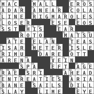 ACROSS 1. Big _ 4. Promenade 8. Greek god of love 12. The sixth month of the Jewish calendar 14. Approach 16. Root beer relative 17. Actor's bit 18. Frustrating wastes of time 20. Failure 22. Compass dir. 23. Greek goddess of the dawn 24. Fast jet (abbr.) 25. Part of HMS, perhaps 28. Ewer handle 30. Printing process, for short 31. Taiwanese island in East China Sea 35. Had dinner 37. Style 40. Beverages made from leaves 41. Austrian river, tributary to the Danube 42. Distance measurement 44. Small island 45. Tall New Zealand timber tree 46. Have the gumption 47. Baseball player Mel 48. Sports stadium 50. Distinctive style or manner 52. Health resort 54. Newt 55. Mature 58. Actress Charlotte 61. _ Lanka 63. Having the leading position 65. Pleas 70. Roberta Peters solo 71. Object of repulsion 72. Travel by water 73. Deli pickle 74. Kill 75. Welles in "The Third Man" 76. Sight organ DOWN 1. Promenades 2. Goodbye (Sp.) 3. 2nd pers. sing. pres. of can (arch.) 4. Make imperfect 5. Black tropical American cuckoo 6. Part of a journey 7. Unable to walk 8. Environmental prefix 9. Hero or heavy, e.g. 10. Margarine 11. Backtalk 13. To riddle 15. To erase 19. 480, 500 or 516 sheets of paper 21. 17th letter of the Greek alphabet 26. A whole individual unit 27. Having a sole or soles 29. Food allowance for one day 30. Summer TV shows 32. Trial 33. Table seasoning 34. Purpose 35. SW Saudi Arabia district 36. Docile 38. _ moment's notice (2 wds.) 39. Impudent aggressiveness 41. Retirement account (abbr.) 43. Coral collection 49. Domed church section 51. Call ___ day 53. Caspian sea tributary 55. Nest on high 56. Lightheartedly 57. Peak District village in England 58. Confederate soldiers (slang) 59. Of or related to the anus 60. Inactive volcano in Sicily 62. Slanted text style (abbr.) 64. Possessed 66. Marina Del _, California 67. One more than two 68. Shade tree 69. Compass dir.