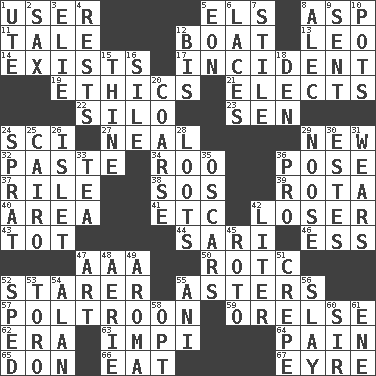 ACROSS 1. One who uses or employs something 5. Raised railways 8. Viper 11. Story 12. Water vessel 13. Lion 14. Is extant 17. Happening 19. Principles of right and wrong 21. Opts 22. Grain storage tower 23. Elected rep. 24. _-fi 27. Anneal 29. ___ Haven, CT 32. Thick mixture 34. Friend of Pooh 36. Airs 37. Cause heat under the collar 38. Mayday 39. Round or rotation of duties 40. Type of rug 41. And so on (abbr.) 42. Failure 43. Small child 44. Indian skirt 46. Double-curved letter 47. Auto club (abbr.) 50. College mil. group 52. A viewer who gazes fixedly 55. Michaelmas daisies 57. Coward 59. Threatening words 62. Epoch 63. Body of Kaffir warriors 64. Ache 65. Spanish title 66. Ingest 67. Jane of fiction DOWN 1. Shoshoni 2. Saxophone 3. Writer Wiesel 4. Musical pauses 5. A really long time 6. Shoestrings 7. Vertical member of a panel or frame 8. Actor Baldwin 9. Transmitted 10. Cooking vessels 12. Twice 15. One or ones belonging to thee 16. Filth; sediment 18. Lair 20. Unrefined 24. Small fatty European fish 25. Capital of Egypt 26. Small island 28. Plunders 29. Trap for birds or small mammals 30. _____ Park, CO 31. Erodes 33. Afternoon social gathering 35. Motion picture awards 36. Adept person 42. 61 cubic inches 45. Printing process, for short 47. Tate display 48. Nest on high 49. Odor 51. Streamer paper 52. Moved rapidly 53. "Corrida" creature 54. ____ Jay Lerner 55. Black tropical American cuckoo 56. Kill 58. Elect 60. Title for a knight 61. Compass dir.