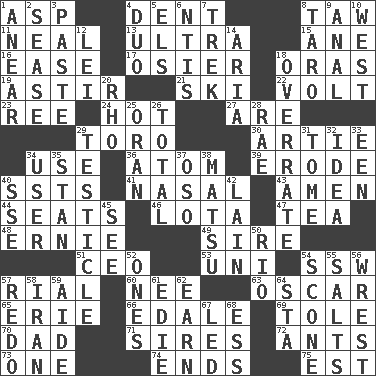 ACROSS 1. Viper 4. Incision 8. The 23rd letter of the Hebrew alphabet 11. Actress Patricia 13. Extreme 15. One (Scot) 16. Relaxation 17. Flexible twig of a willow tree 18. Mouths or openings 19. Having gotten out of bed 21. What Jean-Claude Killy likes to do 22. Electrical Unit 23. To riddle 24. Being at a high temperature 27. "We ___ not amused" (Victoria) 29. "Corrida" creature 30. Nick name for Arthur 34. Purpose 36. Tiny particle 39. Eat (away) 40. Fast planes 41. Rhinal 43. So be it 44. Theater features 46. Globular water bottle used in Asia 47. Beverage made from leaves 48. Bert's buddy 49. The founder of a family 51. Corporate head (abbr.) 53. University (slang) 54. Compass dir. 57. Monetary unit of Yemen 60. Born 63. Motion picture award 65. One of the Great Lakes 66. Peak District village in England 69. Lacquered or enameled metalware 70. Male parent 71. Begets 72. Pismires 73. Single 74. Conclusions 75. Eastern Standard Time (abbr.) DOWN 1. Approach 2. Gospel singer Marvin 3. Thick mixture 4. Superhero pair 5. Raised railways 6. Nuclear Threat Initiatives 7. Long journey 8. Pacific island yam 9. Of or related to the anus 10. 270 degrees 12. Luau accessory 14. Operatic vocal solo 18. Make much ado about nothing 20. 17th letter of the Greek alphabet 25. NW Algerian seaport 26. "_____ Recall" 28. Actress Charlotte 29. A testis 31. Heavy book 32. It may be bright or harebrained 33. Car or cant ending 34. One who uses or employs something 35. Comedian Laurel of Laurel & Hardy 37. Bear (Spanish) 38. Taiwanese island in East China Sea 40. Compass dir. 42. (Had) reclined 45. Observe 50. _ de Janeiro 52. Singles 54. Biscuitlike quick bread 55. Table seasonings 56. Take or capture by force 57. Make new 58. SW Asia republic 59. Assistant 61. Singer Brickell 62. Merit 64. R.R. building 67. Directed 68. Curvy letter