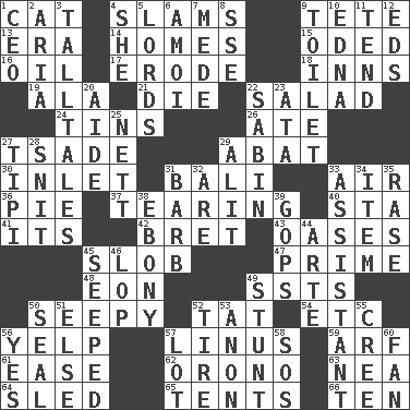 ACROSS 1. Feline 4. Hits or strikes with great force 9. Wig 13. Period 14. Residences 15. Wrote a lyric poem 16. Lubricate 17. Eat (away) 18. Restaurants 19. Chicken ___ king 21. Expire 22. Vegetable dish 24. Airtight sealed metal containers 26. Had dinner 27. Sadhe (variant) 29. Blind as ____ 30. An arm off of a larger body of water 31. Indonesian resort city 33. Atmosphere 36. Sliced dessert 37. Pulling into pieces 40. R.R. building 41. It is 42. Cy Young winner Saberhagen 43. Fertile tracts in a desert 45. Oscar Madison type 47. First class 48. Age 49. Fast planes 50. Not well drained, as in land 52. Make lace 54. And so on (abbr.) 56. Sharp bark 57. "_ and Lucy" (Charlie Brown theme song) 59. Sandy's bark 61. Comfort 62. U. of Maine site 63. Teachers' org. 64. Downhill vehicle 65. Portable shelters 66. Nine, plus one DOWN 1. Corporate head (abbr.) 2. Roberta Peters solo 3. Baron Munchausen's specialties 4. A female animal or person 5. Titled peers of a realm 6. Mine, in Marseilles 7. Ancient Persian 8. Compass dir. 9. Bathroom plumbing fixture 10. Pulitzer Prize-winning author Ferber 11. Watch over 12. Begley and Asner 20. Helper 22. Unit of acoustic absorption 23. "One Day ___ Time" 25. Remaining after all deductions 27. Native american tent (variation) 28. In a ____ (agitated or irritated) 29. Came down and settled, as after flight 31. Sharp remark 32. "We ___ not amused" (Victoria) 33. Helper 34. A whole individual unit 35. Raze (variant) 38. Black 39. Republicans 44. Johnson of "Laugh-In" 45. Oozed 46. Chop off 49. Check the growth or development of 50. Lick closed 51. Otherwise 52. Become fatigued 53. Soon (poet.) 55. Algonquian 56. It is so 57. Car dealer's back yard 58. Mayday 60. Avid follower