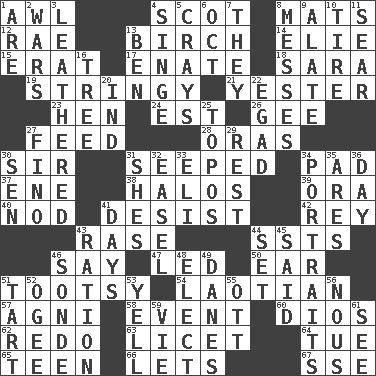 ACROSS 1. Leather borer 4. Highlander 8. Floor protectors 12. Actress Charlotte 13. A tree used for making furniture 14. Writer Wiesel 15. Part of Q.E.F. 17. Related on the mother's side 18. "Two Mules for Sister ____" 19. Slender, wiry 21. Next before 23. Layer 24. Eastern Standard Time (abbr.) 26. Unit of force equal to gravity 27. Nourish 28. Mouths or openings 30. Title for a knight 31. Oozed 34. Groovy apt. 37. Compass dir. 38. Auras 39. Mouth or opening 40. Lower and raise head in agreement 41. Stop 42. Marina Del _, California 43. To erase 44. Fast planes 46. Declare 47. Directed 50. Hearing organ 51. A girl or young woman (variant) 54. Of or relating to Laos or its people 57. Hindu god of fire 58. Happening 60. "Vaya con ____" 62. Make new 63. It is permitted: Lat. 64. Third day of the wk. 65. Adolescent 66. Allows 67. Compass dir. DOWN 1. "We ___ not amused" (Victoria) 2. Armed conflicts 3. Resembling or made to resemble leather 4. Scorch 5. Trading vessels 6. Sep. follower 7. Those people 8. Makes clutter 9. Having winglike extensions 10. Become fatigued 11. Burn superficially 13. Benjamin's nick name 16. Woody plant 20. Working for oneself (abbr.) 22. Mild oath 25. Traditional theme or motif 27. Fine (Spanish) 29. Relief 30. Elected rep. 31. "______ My Girl" (Turtles hit) 32. Artist's stand 33. Connecticut Ivy Leaguer 34. Likenesses of persons 35. Ancient Greek god of war 36. 24 hours 41. 24-hour periods 43. Food allowance for one day 44. Arrange properly for use 45. Stated 46. Message 48. Choose 49. Natives or inhabitants of Denmark 51. Small pie 52. Double curve, resembling the letter S 53. Shout 55. Baseball player Mel 56. Common sense 59. Compete 61. Perceive with the eye