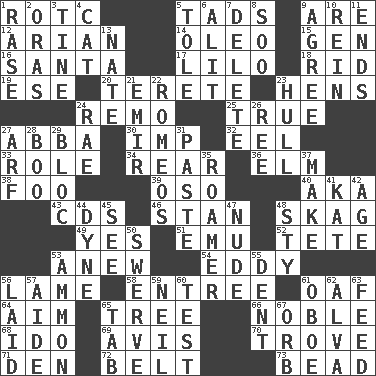 ACROSS 1. College mil. group 5. Small boys 9. "We ___ not amused" (Victoria) 12. Believer in; advocate of (suffix) 14. Butter sub 15. Commissioned military rank (abbr.) 16. Before Barbara or Clara 17. _ and Stitch 18. To free from 19. Compass dir. 20. Cigar-shaped 23. Coop moms 24. San ____ (Riviera town) 25. Loyal 27. Swedish rock group 30. Mischievous child 32. Snakelike fish 33. Hero or heavy, e.g. 34. Located in or toward the back 36. Shade tree 38. Egg _ yung 39. Bear (Spanish) 40. Alias (abbr.) 43. Music discs 46. Comedian Laurel of Laurel & Hardy 48. Heroin 49. Consenting reply 51. Australian flightless bird 52. Wig 53. Afresh 54. Whirlpool 56. Unable to walk 58. Main course 61. Clumsy lout 64. Direct toward a target or goal 65. Relationship diagram 66. Impressive in appearance 68. Wedding promise 69. Advice 70. Collection of objects 71. Lair 72. Waist strap 73. Necklace unit DOWN 1. Raze (variant) 2. Mouths or openings 3. Prong on a fork 4. Feline 5. Lacquered or enameled metalware 6. Set down 7. Erase 8. "Barney Miller" actor Jack 9. Match 10. It's straight from the horse's mouth 11. Conclusions 13. Nathan's nickname 21. Arab leader 22. Lover boys 23. Frame or body of a ship 24. Actress Charlotte 26. Portuguese money of account (variant) 27. Sandy's bark 28. Oct. 31 cry 29. Coalition 31. Thick mixture 35. Wanderer 37. Cause to be 41. Krazy ___ of comics 42. Grow older 44. Centimeter-gram-second unit of force 45. Perceive with the eye 47. Unadorned 48. Filthy place 50. Turn aside suddenly 53. ID or VA city 55. Scratch 56. Put down 57. Assistant 59. Famous astronaut Armstrong 60. Trial 61. Mitch Miller's instrument 62. Inventor's middle name 63. Nourish 65. Bar bill 67. Globe
