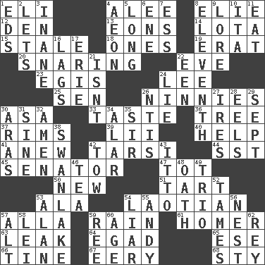 ACROSS 1. Connecticut Ivy Leaguer 4. Toward shelter 8. Writer Wiesel 12. Lair 13. Immeasurably long periods of time 14. Globular water bottle used in Asia 15. Showing deterioration from age 18. Singles 19. Part of Q.E.F. 20. Catching in a trap 22. Night before a holiday 23. The front part of a cuirass 24. Area sheltered from the wind 25. Elected rep. 26. Fools 30. White ___ sheet 33. Clothes sense 36. Family _ (genealogy) 37. Basketball hoops 39. Cards in a Roman deck? 40. Assist 41. Afresh 42. Tarsus (plural) 44. Fast jet (abbr.) 45. Elected representative 47. Small child 50. ___ Haven, CT 51. Small pie 53. Insect wing 54. Of or relating to Laos or its people 57. Silent film actress Nazimova 59. Precipitation 61. Home run 63. Path through which fluid escapes 64. Mild oath 65. Compass dir. 66. Prong on a fork 67. Suggestive of the supernatural 68. Filthy place DOWN 1. Begley and Asner 2. Allows 3. Empty; void 4. Period of immesurable duration 5. Having great length 6. Compass dir. 7. Curvy letter 8. Veterans Day date 9. Old wives' tales, e.g. 10. Call ___ day 11. Consume 16. Falls behind 17. 4th largest of the Great Lakes 21. Is not 22. Car or cant ending 24. Whopper 26. Nuclear Threat Initiatives 27. Angers 28. Snakelike fish 29. Back-to-school mo. 30. Caspian sea tributary 31. Trig term 32. So be it 34. Having or resembling wings 35. Title for a knight 38. Tchaikovsky ballet 42. Pull behind 43. "Tell ____ the Marines!" 46. Beverage made from leaves 48. Pledge 49. Musical group of three 52. Corrects by punishment or discipline 53. ____ Jay Lerner 54. One who doesn't tell the truth 55. Actor Griffith 56. A home for chicks 57. The first octave above the treble staff 58. Luau accessory 59. To sift 60. Mature 62. Marina Del _, California