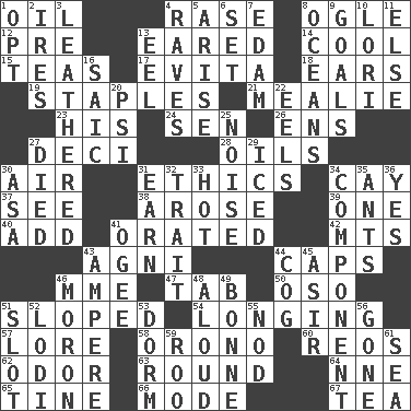 ACROSS 1. Lubricate 4. To erase 8. Stare 12. Before (prefix) 13. Having ears or earlike features 14. Calm and collected 15. Beverages made from leaves 17. Webber/Rice musical 18. Hearing organs 19. Paper fasteners 21. Ear of corn 23. Part of HMS, perhaps 24. Elected rep. 26. Followers of ems 27. Tenth: prefix 28. Petroleums 30. Wind 31. Value system 34. Island 37. Observe 38. Came up 39. Single 40. Find the sum of 41. Spoke pompously 42. Mountains (abbr.) 43. Hindu god of fire 44. Balmoral and tarboosh 46. Madame (abbr.) 47. Keyboard key 50. Bear (Spanish) 51. Had an oblique or slanted direction 54. Yearning 57. Old wives' tales, e.g. 58. U. of Maine site 60. Vintage cars 62. Aroma 63. Single shot of ammunition 64. Compass dir. 65. Prong on a fork 66. Method 67. Beverage made from leaves DOWN 1. Choose 2. Angers 3. Tough but pliablecoriaceous 4. All-night dance parties 5. Originate 6. Arrange properly for use 7. Dutch treat 8. Seas 9. Purposes of endeavors 10. Australian parrot (variant) 11. Otherwise 13. Snakelike fish 16. Ketch in the Levant 20. Air pressure measure (abbr.) 22. Snakelike fish 25. Annoying sound 27. Passed on 29. On the rocks 30. White ___ sheet 31. Merit 32. Distinguishing feature 33. Being at a high temperature 34. Piece 35. Pismires 36. Consenting reply 41. Double curve, resembling the letter S 43. Electrical Unit 44. Gear tooth 45. SW Saudi Arabia district 46. Person of subnormal intelligence 48. Verbally 49. Child's nurse 51. Position in a hierarchy or organization 52. Farming town in central California 53. Dormintory (informal) 55. Allow head to fall sleepily 56. Went 59. Friend of Pooh 61. Ocean