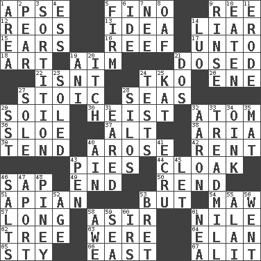 ACROSS 1. Domed church section 5. A pale, very dry sherry 9. Portuguese money of account (variant) 12. Vintage cars 13. It may be bright or harebrained 14. One who doesn't tell the truth 15. Hearing organs 16. Coral collection 17. To (old English) 18. Nonscientific branch of learning 19. Direct toward a target or goal 21. Administered medicine 22. Is not 24. Ring climax 26. Compass dir. 27. Unemotional 28. Oceans 29. Land 30. Robbery 32. Tiny particle 36. A type of plum 37. Keyboard modifier key 38. Roberta Peters solo 39. Look after 40. Came up 42. Monthly bill 43. Sliced desserts 44. Anything that covers or conceals 46. Plant excrement 49. Conclude 50. Tear apart 51. Bee-related 53. Yet 54. Opening into something insatiable 57. Having great length 58. SW Saudi Arabia district 61. The longest river in the world 62. Relationship diagram 63. Past tense of be (plural) 64. Flair 65. Filthy place 66. Compass direction 67. Came down and settled, as after flight DOWN 1. Type of rug 2. Lightbulb-shaped fruit 3. Making a chance decision by using lots 4. Double-curved letter 5. Securely fixed in place 6. Binary compound 7. Born 8. Clumsy lout 9. Remove soap 10. Consumed 11. Eat (away) 14. Nilotic language 19. Cuckoo 20. Hankering 21. Two (Sp.) 23. Having a sole or soles 24. Trials 25. Krazy ___ of comics 27. Not divided or shared with others 28. Grain storage towers 29. Fast jet (abbr.) 31. Having ears or earlike features 32. Composer Copland 33. Excercise machine 34. Pig sound 35. Floor protector 40. The 18th letter of the Arabic alphabet 41. Shade of tan 43. Writing instrument 45. Allow 46. Table seasonings 47. To the left, to Queeg 48. Abounding in pines 52. Grow older 53. Cy Young winner Saberhagen 55. Jai ____ 56. Gone 58. Deep reverence 59. Ocean 60. Big collection agency 61. Teachers' org.