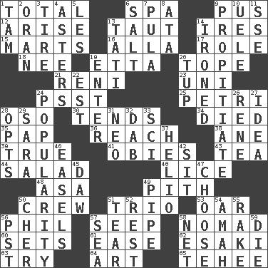 ACROSS 1. "_____ Recall" 6. Health resort 9. Purulenc 12. Ascend 13. Strained 14. Angers 15. Shops 16. Silent film actress Nazimova 17. Hero or heavy, e.g. 18. Born 19. Singer James 20. Drink excessively 21. Painter Guido (1575-1642) 23. Single; one (prefix) 24. Inconspicuous attention getter 25. _ dish (used to culture cells) 28. Bear (Spanish) 30. Is inclined (to) 34. Passed on 35. Infant food 36. Arrive at 38. One (Scot) 39. Loyal 41. Off-Broadway awards 43. Beverage made from leaves 44. First course 46. Louse (plural) 48. White ___ sheet 49. Essential or central part 50. Group working together 51. Musical group of three 53. Rowing implement 56. Silvers or Donahue 57. Ooze 58. Wanderer 60. Arranges properly for use 61. Relaxation 62. 1973 Nobel Price Winner (Physics) Leo 63. Attempt to accomplish something 64. Tate display 65. Giggle DOWN 1. Scottish cap 2. Northwest Algerian city 3. Become fatigued 4. Michaelmas daisies 5. French article 6. Table seasoning 7. Monetary unit of Botswana 8. _ moment's notice (2 wds.) 9. Conciliate 10. Ubangi River tributary 11. Compass dir. 13. Jacques of French films 14. Pressed 19. Keyboard key 20. Uncastrated adult male sheep 22. Eastern Standard Time (abbr.) 24. Teen's desire 26. French philosopher Descartes 27. The main thing one is thinking about 28. Elects 29. "Two Mules for Sister ____" 31. Modern: prefix 32. Pat or tap gently 33. _-fi 37. Sun: prefix 40. Artist's stands 42. Be seated 45. Obsolete 47. Opt 49. Corncob 50. "Mermaids" star 51. Separate forcefully 52. Take ten 54. Wet nurse 55. Libertine 56. Pacific Standard Time (abbr.) 57. Ocean 58. Fish or hair follower 59. Expire
