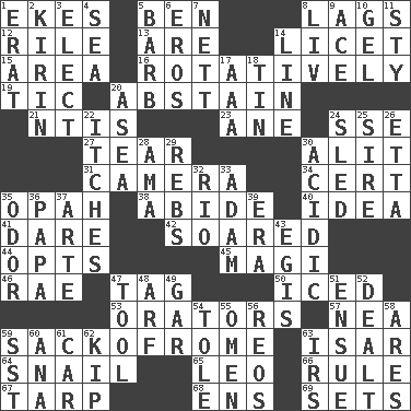 ACROSS 1. Supplements with great effort 5. Benjamin's nick name 8. Falls behind 12. Cause heat under the collar 13. "We ___ not amused" (Victoria) 14. It is permitted: Lat. 15. Length times width 16. Rotating or pertaining to rotation 19. Nervous spasm 20. Refrain by choice 21. Nuclear Threat Initiatives 23. One (Scot) 24. Compass dir. 27. Pull into pieces 30. Came down and settled, as after flight 31. Device for capturing images 34. Certainty 35. Brightly colored fish 38. Remain 40. The main thing one is thinking about 41. Have the gumption 42. Flew 44. Chooses 45. Wise men 46. Actress Charlotte 47. Label 50. On the rocks 53. Speakers 57. Teachers' org. 59. Italian handbag shop? 63. Austrian river, tributary to the Danube 64. Slow-paced one 65. Lion 66. Court order 67. Canvas cover 68. Followers of ems 69. Puts into a specified state DOWN 1. Part of Q.E.F. 2. Japanese brewing company 3. Voters do this 4. Ocean 5. Sharp remark 6. Greek god of love 7. Remaining after all deductions 8. 54 in ancient Rome 9. Adept person 10. Set 11. Filthy place 14. Actor's bit 17. American Automobile Association (abbr.) 18. Metal container 20. Toward the sea 22. Strong, restless desires 24. Downhill vehicle 25. The founder of a family 26. Singer James 28. Wet nurse (var.) 29. Confederate soldiers (slang) 30. Being or containing an acid 32. _ de Janeiro 33. First man 35. Aroma 36. Dad 37. Johnson of "Laugh-In" 39. Period 43. The front part of a cuirass 47. Utensil 48. Sandy's bark 49. Slender fish 51. Take place subsequently 52. Started a card game 54. Lacquered or enameled metalware 55. Presage 56. Vintage cars 58. Ancient Greek god of war 59. Fast jet (abbr.) 60. Santa ___, CA 61. Automobile 62. Monetary unit of Laos 63. Big collection agency