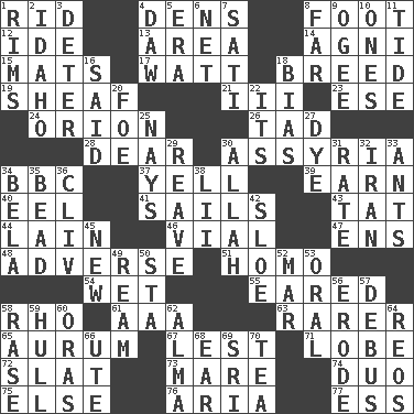 ACROSS 1. To free from 4. Cub Scout units 8. Lowest support of a structure 12. Binary compound 13. Type of rug 14. Hindu god of fire 15. Floor protectors 17. Electrical Unit 18. A special lineage 19. To gather and bind into a bundle 21. One more than two 23. Compass dir. 24. Greek mythologigal hunter 26. Bit 28. Letter starter 30. Nineveh was its capital 34. English channel? 37. Shout 39. Merit 40. Snakelike fish 41. Travel by water 43. Make lace 44. (Had) reclined 46. Small bottle 47. Followers of ems 48. Contrary to your interests or welfare 51. Same (prefix) 54. Dripping 55. Having ears or earlike features 58. 17th letter of the Greek alphabet 61. Auto club (abbr.) 63. More valued for its uncommonness 65. Gold (Symbol: Au) 67. For fear that 71. Ear part 72. Narrow board 73. Female horse 74. Superhero pair 75. Otherwise 76. Operatic vocal solo 77. Curvy letter DOWN 1. Basketball hoops 2. Potato state 3. Prevent from occurring 4. Obsolete 5. Epoch 6. Fish or hair follower 7. Suttee (variant) 8. At a great distance 9. Double curve, resembling the letter S 10. Washington bills 11. Periodic rise and fall of the sea level 16. Expressed in words 18. Prejudice 20. Enemy 22. ___ a Wonderful Life 25. Negative votes 27. Color 29. Break or tear apart 30. Assad's deity 31. Assign a rank or rating to 32. SW Asia republic 33. Pismires 34. Actor Lugosi 35. Necklace unit 36. 154 in Roman numerals 38. Cards in a Roman deck? 42. _ gin 45. ___ Haven, CT 49. 480, 500 or 516 sheets of paper 50. R.R. building 52. Third mo. 53. Of the mouth 56. Eat (away) 57. To get out of a bus 58. Raze (variant) 59. Frame or body of a ship 60. Mouths or openings 62. _ mater 64. Vintage cars 66. Shoshoni 68. Hearing organ 69. Indian title of respect (Mr.) 70. Beverage made from leaves