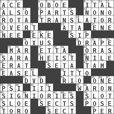 ACROSS 1. Adept person 4. Mitch Miller's instrument 8. Slanted text style (abbr.) 12. In addition 14. Components 16. Words to Nanette 17. Roll call or roster of names 18. Interpreter 20. Unconcealed 22. _ moment's notice (2 wds.) 23. Compass dir. 24. Born 25. Supplement with great effort 28. Small drink 30. The longest river in Central Asia 31. Window treatment 35. Impair 37. Singer James 40. Mouths or openings 41. "Two Mules for Sister ____" 42. Robbery 44. The longest river in the world 45. Part of Q.E.F. 46. Bristle 47. Scottish cap 48. Artist's stand 50. "Tell ____ the Marines!" 52. Movie disc 54. _ de Janeiro 55. Single 58. 23rd letter of the Greek alphabet 61. One more than two 63. Make _____ (do battle with) 65. Seigniories (variant) 70. Narrow, elongated depression 71. A type of plum 72. Religious groups 73. Introduce or present, as a question 74. "Corrida" creature 75. Religious group 76. For each DOWN 1. Composer Copland 2. Garlic unit 3. First name in cosmetics 4. Elect 5. Drinking establishment 6. Mouth or opening 7. Inactive volcano in Sicily 8. _ tizzy (2 wds.) 9. Haul 10. At once, immediately (arch.) 11. Old wives' tales, e.g. 13. Boat paddle 15. Fast planes 19. Put down 21. John Ritter's dad 26. Malaysian steamed pastry 27. _____ Park, CO 29. Right away 30. Spoke pompously 32. Roberta Peters solo 33. Inside of hand 34. Compass dir. 35. Hindu Mythology: god of death 36. Caspian sea tributary 38. Neckwear 39. Moving about 41. Perceive with the eye 43. Jacques of French films 49. 57 in ancient Rome 51. Pull behind 53. "Vaya con ____" 55. Fourth or lowest deck 56. Trap for birds or small mammals 57. Keyboard key 58. Inconspicuous attention getter 59. Grain storage tower 60. Russian composer Stravinsky 62. Angers 64. Cleo's killer 66. Modern: prefix 67. Frozen water 68. And so on (abbr.) 69. Fast jet (abbr.)