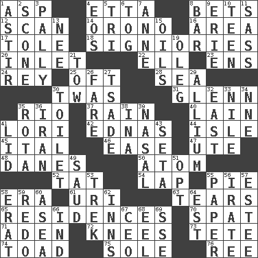 ACROSS 1. Viper 4. Singer James 8. Stakes 12. Glance over 14. U. of Maine site 16. Length times width 17. Lacquered or enameled metalware 18. Seigniories (variant) 20. An arm off of a larger body of water 22. Pipe bend 23. Followers of ems 24. Marina Del _, California 25. Often (poetically) 28. Ocean 30. It was, poetically 31. American astronaut and politician John 35. River (Sp.) 37. Water falling in drops from the sky 40. (Had) reclined 41. Australian parrot (variant) 42. Ferber et al. 44. Small island 45. Slanted text style (abbr.) 46. Relaxation 47. Shoshoni 48. Natives or inhabitants of Denmark 50. Tiny particle 52. Make lace 54. Pet locale 55. Sliced dessert 58. Period 61. RI univ. 63. Pulls apart 65. Dwellings 70. Argument over a trivial matter 71. Arabian gulf 72. Leg joints 73. Wig 74. Frog relative 75. Not divided or shared with others 76. To riddle DOWN 1. Moving or stirring 2. Biscuitlike quick bread 3. Chummy 4. Greek goddess of the dawn 5. Three (prefix) 6. Coat; cloak 7. Singer Murray 8. Soap unit 9. One of the Great Lakes 10. Adolescent 11. Backtalk 13. Born 15. Petroleums 19. Cassini of fashion 21. Pull behind 26. Conductor's collection 27. Sadhe (variant) 29. Plant genus of onion and garlic 30. Rest room 32. 90 degrees 33. The longest river in the world 34. Compass dir. 35. Round or rotation of duties 36. SW Asia republic 38. _ tizzy (2 wds.) 39. Rhinal 41. Flaplike covering 43. Bristle 49. Saudi Arabian king (1953-1964) 51. Choose 53. Long journey 55. Some stationery 56. Feeling or showing extreme anger 57. First name in cosmetics 58. Part of Q.E.F. 59. Redecorate 60. At sea 62. Taverns 64. Eastern Standard Time (abbr.) 66. Indiana (abbr.) 67. Corporate head (abbr.) 68. Snakelike fish 69. Compass dir.