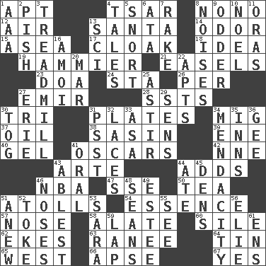 ACROSS 1. Fitting 4. Russian ruler of old 8. Words to Nanette 12. Atmosphere 13. Before Barbara or Clara 14. Aroma 15. Toward the sea 17. Anything that covers or conceals 18. The main thing one is thinking about 19. More given to overacting 21. Artist's stands 23. ___ good deed 24. R.R. building 26. For each 27. Independent ruler or chieftain 28. Fast planes 30. Three (prefix) 31. Food holders 34. Russian fighter aircraft 37. Petroleum 38. Indian antelope 39. Compass dir. 40. Set 41. Motion picture awards 42. Compass dir. 43. Johnson of "Laugh-In" 44. Does sums 46. Basketball assoc. 47. Compass dir. 50. Afternoon social gathering 51. Ringlike coral islands and reefs 54. Core 57. Olfactory organ 58. Having winglike extensions 60. Drop; flow; fall 62. Makes supply last 63. The wife of a rajah (variant) 64. Metal container 65. Compass direction 66. Domed church section 67. Consenting reply DOWN 1. American Automobile Association (abbr.) 2. Expression of disdain 3. Excercise machine 4. Falsehoods 5. Derisive sound 6. _ moment's notice (2 wds.) 7. Immoral or dissolute person 8. Annoying sounds 9. More peculiar 10. Christmas carol 11. Mouths or openings 13. _-fi 16. Mine, in Marseilles 20. Make imperfect 22. Flats, for short 25. Being in motion 27. One of the Great Lakes 29. Elected reps. 30. Coat; cloak 31. Inconspicuous attention getter 32. Shoestrings 33. White ___ sheet 34. Ananias' fault 35. Restaurants 36. Unit of force equal to gravity 41. Relating to the mouth 43. Most capable 44. Had dinner 45. Hiding places for outlaws 46. Olfactory organs 48. Actors Connery and Penn 49. First name in cosmetics 51. Afresh 52. Puff or smoke 53. "Two Mules for Sister ____" 55. Perceive with the eye 56. Writer Wiesel 59. Pet locale 61. Followers of ems