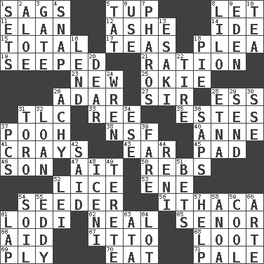 ACROSS 1. Sinks 5. Uncastrated adult male sheep 8. Allow 11. Liveliness 12. American tennis player Robert 14. Binary compound 15. Add up to 17. Beverages made from leaves 18. Entreaty 19. Oozed 21. Food allowance for one day 23. ___ Haven, CT 25. Migrant worker of the '30s 26. The sixth month of the Jewish calendar 27. Title for a knight 28. Double-curved letter 31. Affectionate concern, for short 33. Portuguese money of account (variant) 35. _____ Park, CO 37. "Silly old bear" 38. Overdraft (abbr.) 40. Queen of England 1702-14 41. Trading vessels 43. Ewer handle 45. Groovy apt. 46. Male offspring 47. Small island 50. Confederate soldiers (slang) 52. Louse (plural) 53. Compass dir. 54. Sowing specialist 56. New York city 61. Farming town in central California 62. Anneal 65. Sir (Sp.) 66. Assist 67. "Tell ____ the Marines!" 68. Plunder 69. Travel a route regularly 70. Consume 71. Diluted with white DOWN 1. Puts into a specified state 2. Medicinal plant 3. Yard entry 4. Fastener 5. Make lace 6. Purpose 7. N Egypt peninsula 8. _ and Stitch 9. Paradise 10. Afternoon social gathering 13. 1973 Nobel Price Winner (Physics) Leo 16. Grant temporary use of 18. Sliced dessert 20. Letter starter 22. Hoop that covers a wheel 24. Songbird 26. Painful 28. Inactive volcano in Sicily 29. Post 30. Compass dir. 31. "Corrida" creature 32. Grant temporary use of 34. Compass dir. 36. Plant excrements 37. Personal Computers (abbr.) 39. Conductor's collection 42. Alleged 44. Painter Guido (1575-1642) 48. Ancient Celtic tribe of eastern Britain 49. Cylindrical with tapered ends 51. Antes 52. Luau accessory 54. Earth 55. Whirlpool 57. Assist 58. Small Philippine buffalo 59. Calm and collected 60. Johnson of "Laugh-In" 61. Infant locale 63. _ moment's notice (2 wds.) 64. Car dealer's back yard