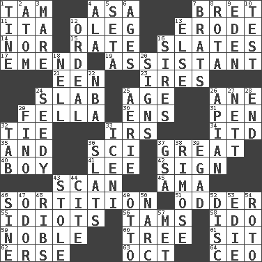 ACROSS 1. Scottish cap 4. White ___ sheet 7. Cy Young winner Saberhagen 11. Call ___ day 12. Cassini of fashion 13. Eat (away) 14. And not 15. Assign a rank or rating to 16. Chalkboards 17. Make improvements or corrections to 19. Aide 21. Car or cant ending 23. Angers 24. Thick slice 25. Personal question 26. One (Scot) 29. Chap (slang) 30. Followers of ems 31. Animal enclosure 32. Standoff 33. Big collection agency 34. It would 35. Added to 36. _-fi 37. Relatively large 40. Male child 41. Area sheltered from the wind 42. Omen 43. Glance over 45. Wet nurse (var.) 46. Making a chance decision by using lots 51. More peculiar 55. Foolish or stupid persons 56. Scottish caps 58. Wedding promise 59. Having high moral qualities 60. Family _ (genealogy) 61. Be seated 62. Celtic language 63. Sep. follower 64. Corporate head (abbr.) DOWN 1. Prong on a fork 2. Smallest unit of an element 3. Female horse 4. In the manner of 5. Bristle 6. Eons 7. Naughty children 8. Roll call or roster of names 9. Paradise 10. Trial 12. Severe or trying experience 13. Otherwise 16. Fathers 18. 1994 drama film starring Jodie Foster 20. Public displays of written messages 22. Basketball assoc. 24. Morally degraded 25. Nest on high 26. Bee-related 27. Remaining after all deductions 28. Conclude 29. Fine (Spanish) 32. Bar bill 33. Ancient Celtic tribe of eastern Britain 36. Narrow boards 37. Girls' org. (abbr.) 38. Full of chinks, cracks, or crevices 39. Mild oath 43. Took without asking 44. Quote 46. Trig term 47. Scent 48. Teases 49. Von Bismarck 50. Drug cop 52. Plate 53. Singer Brickell 54. Printing process, for short 57. Was introduced to