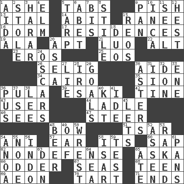 ACROSS 1. American tennis player Robert 5. Bar bills 9. Expression of disdain 13. Slanted text style (abbr.) 14. "This won't hurt ____!" 15. Indian princess (variant) 16. Dormintory (informal) 17. Homes 19. According to 20. Fitting 21. Nilotic language 22. The first octave above the treble staff 23. Greek god of love 25. Greek goddess of the dawn 26. Former Milwaukee Brewers owner Bud 30. Assistant 34. Capital of Egypt 35. The Jewish people; Israel 36. Monetary unit of Botswana 39. 1973 Nobel Price Winner (Physics) Leo 42. Prong on a fork 43. One who uses or employs something 44. Dipping utensil 46. Observes 47. Bull 48. Arrow shooter 51. Russian ruler of old 54. Black tropical American cuckoo 57. Ewer handle 58. It is 60. Plant excrement 62. Unrelated to defense, as in spending 65. "____ silly question..." 66. More peculiar 67. Oceans 68. Adolescent 69. Period of immesurable duration 70. Small pie 71. Extremities DOWN 1. Opera by Verdi 2. Took without asking 3. Ethiopian city, capital of Harari 4. Shade tree 5. Canvas cover 6. Collude with 7. Twice 8. Vertical member of a panel or frame 9. Baking dish 10. South American Indian 11. Sew up the eyelids of hawks and falcons 12. Behest 15. Vintage cars 18. Superhero pair 20. Toward the sea 24. Motion picture awards 27. Falsehood 28. Big collection agency 29. Finish lines 30. Michaelmas daisies 31. One more than two 32. Spanish title 33. Compass dir. 36. Suppuration 37. Purpose 38. Area sheltered from the wind 40. Krazy ___ of comics 41. Binary compound 45. Allows 48. Fermented drink made from hops 49. Clumsy lout 50. Obtain by seizing forcibly or violently 52. NE Netherlands city 53. Moved through 54. Small Philippine buffalo 55. Thickened enlargement 56. Southeast Asian peninsula 58. Austrian river, tributary to the Danube 59. Trial 61. Baking dishes 63. Lair 64. Teachers' org. 65. Had dinner
