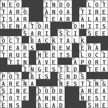 ACROSS 1. Modern: prefix 4. Southeast Asian peninsula 8. Car dealer's back yard 11. Edible starchy tuberous root 13. Small Philippine buffalo 14. Become fatigued 15. Austrian river, tributary to the Danube 16. Pull into pieces 17. Having or resembling wings 18. Legislator 21. Leaves out 22. Indian skirt 23. _-fi 25. Perceive with the eye 26. Sep. follower 29. Sass 32. Separates forcefully 34. ___ Haven, CT 35. Epoch 38. Loyal 39. Confronts 41. Venues 43. Metal container 44. "___ Maria" 45. To the left, to Queeg 46. Eaten 50. Afternoon social gathering 51. Plant holder 54. Again 55. Extremities 57. Sports stadium 59. Inhabiting a nest 63. Trig term 64. Texas town _ City 67. Length times width 68. Carryall 69. Singer Murray 70. A home for chicks 71. Followers of ems 72. Necklace unit 73. A female animal or person DOWN 1. Nuclear Threat Initiatives 2. Comfort 3. Northwest Algerian city 4. Of or pertaining to medicine 5. Compass dir. 6. ___ good deed 7. Rowing implement 8. Ms. Damita and namesakes 9. Speak pompously 10. Laconic 12. Mouths or openings 14. Scottish cap 19. Bar bills 20. Mouth or opening 21. Lubricate 23. Proofreading order 24. Crow sounds 26. Baseball player Mel 27. An absolute certainty 28. "Change" in Tahitian 30. Leg joints 31. Seaweed 33. Painter Guido (1575-1642) 36. Carrot, for example 37. 43,560 square feet 39. Wise men 40. Nights before holidays 42. Call ___ day 45. Sums up 47. Basketball assoc. 48. Watched over 49. Compass dir. 51. Thick mixture 52. Greek mythologigal hunter 53. Portable shelters 56. Comedian Laurel of Laurel & Hardy 58. Born 60. Angers 61. Soft 62. Yard entry 64. Pat or tap gently 65. Single 66. Heredity factor (abbr.)