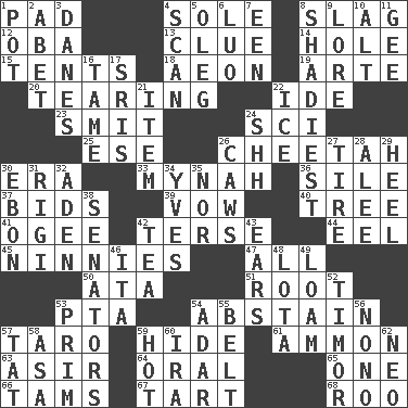 ACROSS 1. Writing tablet 4. Not divided or shared with others 8. Volcanic refuse 12. Chief or king in Benin or Nigeria 13. A slight indication 14. Hollow 15. Portable shelters 18. A really long time 19. Johnson of "Laugh-In" 20. Rending 22. Binary compound 23. Stricken, poetically 24. _-fi 25. Compass dir. 26. Leopard's kin 30. Epoch 33. Non-adult bird? 36. Drop; flow; fall 37. Auction offers 39. Solemn pledge 40. Relationship diagram 41. Double curve, resembling the letter S 42. Laconic 44. Snakelike fish 45. Simpletons 47. Everything 50. _ moment's notice (2 wds.) 51. Carrot, for example 53. Parent Teacher Association (abbr.) 54. Choose not to consume 57. Edible starchy tuberous root 59. Flintstone garb 61. ID or VA city 63. SW Saudi Arabia district 64. Spoken 65. Single 66. Scottish caps 67. Small pie 68. Friend of Pooh DOWN 1. Cooking vessel 2. Collude with 3. Natives or inhabitants of Denmark 4. Examine hastily 5. Cassini of fashion 6. Nilotic language 7. Car or cant ending 8. Most dubious of character or honesty 9. Old wives' tales, e.g. 10. Keyboard modifier key 11. Turn to the right 16. Not wild 17. Indian titles of respect 21. Detail 22. Frozen water 24. Quiet! 26. Crow sounds 27. Become fatigued 28. Toward shelter 29. Person who is morally reprehensible 30. Inky black, to poets 31. Swiss mountan, "Queen of the Mountains" 32. Arabian gulf 34. Jacques Cousteau's middle name 35. Or not 38. Legislators 42. Beverage made from leaves 43. Hearing organs 46. Call ___ day 48. Globular water bottle used in Asia 49. Rich soil 52. The easternmost of the Lesser Sundas 53. Demure 54. The sixth month of the Jewish calendar 55. Waist strap 56. Words to Nanette 57. Make lace 58. White ___ sheet 59. Being at a high temperature 60. Lyricist Gershwin 62. Modern: prefix