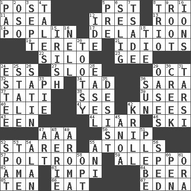 ACROSS 1. Mail 5. Pacific Standard Time (abbr.) 8. Three (prefix) 11. At sea 12. Angers 13. Friend of Pooh 14. Cotton for raincoats, e.g. 17. Conveyance 19. Cylindrical with tapered ends 21. Foolish or stupid persons 22. Grain storage tower 23. Turn to the right 24. Double-curved letter 27. _ gin 29. Sep. follower 32. Staphylococcus 34. Small boy 36. "Two Mules for Sister ____" 37. Jacques of French films 38. Compass dir. 39. One who makes use of a thing 40. Writer Wiesel 41. Consenting reply 42. Leg joints 43. Car or cant ending 44. One who doesn't tell the truth 46. What Jean-Claude Killy likes to do 47. American Automobile Association (abbr.) 50. Sever or remove by pinching or nipping 52. A viewer who gazes fixedly 55. Ringlike coral islands and reefs 57. Characterized by complete cowardliness 59. City in Syria 62. Wet nurse (var.) 63. Body of Kaffir warriors 64. Fermented drink made from hops 65. Nine, plus one 66. Consume 67. Pulitzer Prize-winning author Ferber DOWN 1. Infant food 2. Bear (Spanish) 3. Back-to-school mo. 4. Stories 5. Before (prefix) 6. Major League Baseball Commissioner Bud 7. Sadhe (variant) 8. Musical group of three 9. Carrot, for example 10. Charged particles 12. Binary compound 15. From or relating to Ireland 16. 1994 drama film starring Jodie Foster 18. Neckwear 20. Tootsie (variant) 24. First name in cosmetics 25. Showing deterioration from age 26. Smooth fabric 28. Artist's stand 29. Fertile tracts in a desert 30. Small stream 31. Tarsus (plural) 33. Sliced dessert 35. Cease 36. Player for Phoenix 42. The principal food of baleen whales 45. Small Philippine buffalo 47. Tate display 48. Nest on high 49. Scent 51. Military trainee 52. Argument over a trivial matter 53. Heavy book 54. Actor Alda or Thicke 55. Black tropical American cuckoo 56. Moved rapidly 58. Elect 60. Animal enclosure 61. Mouth or opening