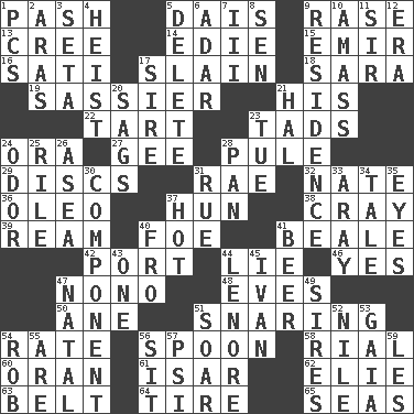 ACROSS 1. Romantic infatuation 5. Raised platform 9. To erase 13. Algonquian 14. Singer Brickell 15. Arab leader 16. Suttee (variant) 17. Killed 18. "Two Mules for Sister ____" 19. More disrespectful 21. Part of HMS, perhaps 22. Small pie 23. Small boys 24. Mouth or opening 27. Unit of force equal to gravity 28. Whimper 29. Plates 31. Actress Charlotte 32. Nathan's nickname 36. Margarine 37. Attila the _ 38. Supercomputer manufacturer 39. 480, 500 or 516 sheets of paper 40. Enemy 41. Calif. Air Force Base 42. Sweet dark-red dessert wine 44. Falsehood 46. Consenting reply 47. Words to Nanette 48. Nights before holidays 50. A saturated hydrocarbon 51. Catching in a trap 54. Assign a rank or rating to 56. Soup utensil 58. Monetary unit of Yemen 60. NW Algerian seaport 61. Austrian river, tributary to the Danube 62. Writer Wiesel 63. Waist strap 64. Become fatigued 65. Oceans DOWN 1. Personal Computers (abbr.) 2. Ancient river in northeast Turkey 3. Bristle 4. Robbery 5. Erase 6. The sixth month of the Jewish calendar 7. One more than two 8. Elected rep. 9. Home 10. Collect or gather 11. Title for a knight 12. Period 17. Male parent of an animal 20. Settles 21. Actor Linden 23. Third day of the wk. 24. Scent 25. Cause heat under the collar 26. At sea 28. Baking dish 30. Piece 31. Regret 33. Like ___ of sunshine 34. Falsehood 35. Snake ____ (dice throw) 37. Being at a high temperature 40. From 41. Fermented drink made from hops 43. Single 44. Poe poem 45. "Terrible" tsar 47. Relating to or accompanying birth 49. Male parents of animals 51. Fly high 52. "Death on the ____" 53. Greek goddess of the earth (variant) 54. Director Reiner 55. "We ___ not amused" (Victoria) 56. Be seated 57. 23rd letter of the Greek alphabet 59. French article