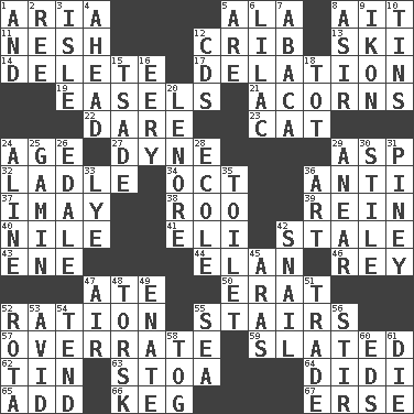 ACROSS 1. Roberta Peters solo 5. Chicken ___ king 8. Small island 11. Soft 12. Baby bed with high sides 13. What Jean-Claude Killy likes to do 14. Keyboard key 17. Conveyance 19. Artist's stands 21. Oak nuts 22. Have the gumption 23. Feline 24. Personal question 27. Centimeter-gram-second unit of force 29. Viper 32. Dipping utensil 34. Sep. follower 36. Opposed to 37. "If ____ say so..." 38. Friend of Pooh 39. It's straight from the horse's mouth 40. "Death on the ____" 41. Connecticut Ivy Leaguer 42. Lacking originality or spontaneity 43. Compass dir. 44. Flair 46. Marina Del _, California 47. Had dinner 50. Part of Q.E.F. 52. Food allowance for one day 55. Flight of steps 57. Make much ado about nothing 59. Scheduled 62. Metal container 63. Portico 64. "You Light Up My Life" star Conn 65. Increase 66. Cask 67. Celtic language DOWN 1. Plus 2. To separate or throw off 3. Capri or Wight 4. Forward in time 5. "We ___ not amused" (Victoria) 6. Pale purple color 7. Phillipine bananalike plant 8. SW Saudi Arabia district 9. Picture 10. Metal containers 12. Music discs 15. Sadhe (variant) 16. Suggestive of the supernatural 18. Small child 20. Poe poem 24. Place in a line 25. Street urchin 26. Peak District village in England 28. Learning spot: Fr. 29. Approach 30. Vertical member of a panel or frame 31. Abounding in pines 33. Sodium hydroxide 35. Bathroom plumbing fixture 36. Nonscientific branch of learning 42. Slow-paced one 45. Caspian sea tributary 47. Wind 48. Cod relative 49. Related on the mother's side 51. Exchange 52. Round or rotation of duties 53. Enthusiastic 54. Be inclined (to) 55. Ocean 56. Agitate 58. Coat; cloak 60. Begley and Asner 61. Expire
