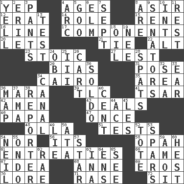 ACROSS 1. Slangy assent 4. Matures 8. SW Saudi Arabia district 12. Part of Q.E.F. 14. Hero or heavy, e.g. 15. French philosopher Descartes 16. Actor's bit 17. Parts 20. Allows 21. Make a knot 22. The first octave above the treble staff 23. Unemotional 27. For fear that 29. Prejudice 31. Introduce or present, as a question 34. Capital of Egypt 35. Type of rug 36. Hindu Mythology: god of death 39. Affectionate concern, for short 41. Russian ruler of old 42. So be it 43. Allots cards 46. Dad 47. At one time in the past 48. Water jar 51. Trials 54. Not either 56. ___ a Wonderful Life 58. Brightly colored fish 61. Pleas 66. Docile 67. The main thing one is thinking about 68. Singer Murray 69. Greek god of love 70. Old wives' tales, e.g. 71. Raze (variant) 72. Be seated DOWN 1. Shout 2. 4th largest of the Great Lakes 3. Leg coverings 4. Curve 5. Thick or sticky substance 6. Shade tree 7. Back-to-school mo. 8. "We ___ not amused" (Victoria) 9. Legislators 10. International (abbr.) 11. Take ten 13. Trial 18. Petroleum 19. Born 24. Chief or king in Benin or Nigeria 25. One more than two 26. Draw slowly or heavily 28. Arguments over trivial matters 30. Twentieth part of a lira 32. Ocean 33. Hearing organ 34. Lessep's creation 36. Atlas unit 37. Nanny (var.) 38. Newsperson 40. Penny 44. Adept person 45. French article 49. Whopper 50. _ moment's notice (2 wds.) 52. Carry 53. Practice fights 54. Famous astronaut Armstrong 55. Southwest Nigerian state 57. Play the lead 59. Mine, in Marseilles 60. Behest 62. Actress Charlotte 63. _ tizzy (2 wds.) 64. Followers of ems 65. Observe
