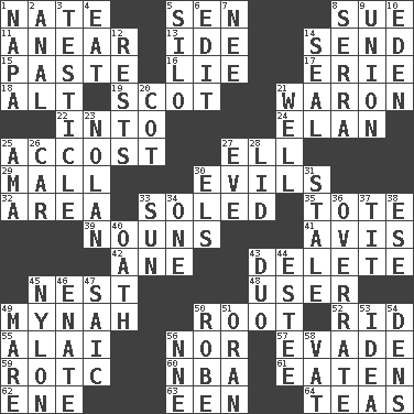 ACROSS 1. Nathan's nickname 5. Elected rep. 8. Take to court 11. Approach 13. Binary compound 14. Post 15. Thick mixture 16. Untruth 17. One of the Great Lakes 18. The first octave above the treble staff 19. Native of Scotland 21. Make _____ (do battle with) 22. To the inside or interior of 24. Flair 25. Buttonhole 27. Pipe bend 29. Shopping center 30. Vices 32. Type of rug 33. Having a sole or soles 35. Carryall 39. Parts of speech 41. Advice 42. One (Scot) 43. Erase 45. A home for chicks 48. One who makes use of a thing 49. Non-adult bird? 50. Carrot, for example 52. To free from 55. Jai ____ 56. Not either 57. Dodge 59. College mil. group 60. Basketball assoc. 61. Eroded 62. Compass dir. 63. Car or cant ending 64. Beverages made from leaves DOWN 1. California wine valley 2. Of or related to the anus 3. A testis 4. Erode 5. Grain storage tower 6. Prepare for publication 7. Born 8. Father Junipero _ 9. The state of being joined or united 10. Locale of original sin 12. Musical pauses 14. Lick closed 20. Small bed 21. Not ill 23. Pitcher Ryan 25. Housemaid (var.) 26. 4-wheeled motor vehicle 27. First lady 28. Hat (slang) 30. Raised railways 31. Showing deterioration from age 33. Player for Phoenix 34. Single 36. Make much ado about nothing 37. Teat (slang) 38. Compass dir. 40. Pledge 43. Superhero pair 44. First name in cosmetics 45. High-strength synthetic material 46. Related on the mother's side 47. Ketch in the Levant 49. Female horse 50. Loose flowing garment 51. NW Algerian seaport 53. It may be bright or harebrained 54. Cub Scout units 56. Compass dir. 58. Large container