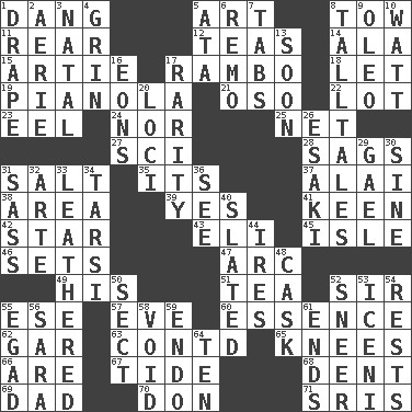 ACROSS 1. Mild oath, euphamism for damn 5. Tate display 8. Pull behind 11. Stern 12. Afternoon social gatherings 14. In the manner of 15. Nick name for Arthur 17. Role for Stallone 18. Allow 19. Player piano 21. Bear (Spanish) 22. Car dealer's back yard 23. Snakelike fish 24. And not 25. Fish or hair follower 27. _-fi 28. Sinks 31. Table seasoning 35. It is 37. Jai _ 38. Length times width 39. Affirmative reply 41. Peachy ____! 42. Play the lead 43. Biblical high priest 45. Small island 46. Arranges properly for use 47. Curve 49. Part of HMS, perhaps 51. Afternoon social gathering 52. Title for a knight 55. Compass dir. 57. Night before a holiday 60. Center 62. Slender fish 63. Continued (abbr.) 65. Leg joints 66. "We ___ not amused" (Victoria) 67. Event that recurs at intervals 68. Scratch 69. June honoree 70. Spanish title 71. Indian titles of respect DOWN 1. Window treatment 2. Nest on high 3. Relating to or accompanying birth 4. Amused look 5. "One Day ___ Time" 6. San ____ (Riviera town) 7. Bar bills 8. Baron Munchausen's specialties 9. Margarine 10. Electrical Unit 13. Within a short period 16. Immeasurably long periods of time 17. Noteworthy scarcity 20. Event scenes 26. 1973 Nobel Price Winner (Physics) Leo 29. Highlander 30. Trig term 31. Backtalk 32. Johnson of "Laugh-In" 33. Resembling or made to resemble leather 34. Tarsus (plural) 36. Observe 40. Scheduled 44. Angers 48. Keg 50. Religious group 52. Contemptuous expression 53. Ancient Celtic tribe of eastern Britain 54. Musical pauses 55. Mild oath 56. "Two Mules for Sister ____" 58. Empty area or space 59. Inside; within (prefix) 61. Conclusions 64. Nine, plus one