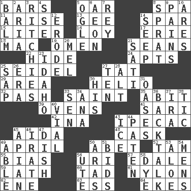 ACROSS 1. Long, evenly shaped pieces 5. Boat paddle 8. Health resort 11. Originate 13. Turn to the right 14. Coast Guard woman 15. 61 cubic inches 16. Myrna of the movies 17. 4th largest of the Great Lakes 18. Apple computer (short form) 19. Presage 21. Actors Connery and Penn 22. Flintstone garb 24. Flats, for short 25. Beer mug 27. Make lace 29. Type of rug 30. Sun: prefix 32. Romantic infatuation 33. Inhabitant of Heaven 35. "This won't hurt ____!" 39. Baking chambers 41. Indian skirt 42. _ tizzy (2 wds.) 43. Medicinal drug used to evoke vomiting 45. Opera by Verdi 48. Keg 49. Showery time 50. Collude with 52. Scottish cap 55. Prejudice 56. RI univ. 57. Peak District village in England 59. Thin strip of wood or metal 60. Small boy 61. High-strength synthetic material 62. Compass dir. 63. Double-curved letter 64. Makes supply last DOWN 1. Lip ointment 2. Operatic vocal solo 3. Actors Guy, Robert Welles, and Clint 4. Compass dir. 5. Stare at amorously 6. A really long time 7. Marina Del _, California 8. Small fatty European fish 9. Aches 10. Ancient Greek god of war 12. Wear away 14. Ooze 20. Cartoonist voice _ Blanc 21. Suttee (variant) 23. Potato state 25. Plant excrement 26. Epoch 27. Nine, plus one 28. Keyboard modifier key 30. Part of HMS, perhaps 31. Fertile tracts in a desert 33. Elected rep. 34. Santa ___, CA 36. Sass 37. Retirement account (abbr.) 38. Nervous spasm 40. Small bottle 43. Frozen water 44. Eucharist need 45. Bee-related 46. Feeling or showing extreme anger 47. Food container 49. Competent 50. Caspian sea tributary 51. Auction offers 53. Medicinal plant 54. Not women's 56. Shoshoni 58. Color