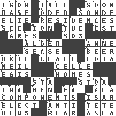 ACROSS 1. Composer Stravinsky 5. Story 9. Within a short period 13. To erase 14. Wrote a lyric poem 15. Something which is sent 16. Writer Wiesel 17. Dwellings 19. Observe 20. Electrically charged atom 21. Third day of the wk. 22. Eastern Standard Time (abbr.) 23. Ancient Greek god of war 25. Distress signal 26. Tree or shrub in the Birch family 30. Singer Murray 34. Gospel singer Marvin 35. Fermented drink made from hops 36. Migrant worker of the '30s 39. Memphis, Tenn. Street 42. Globular water bottle used in Asia 43. Famous astronaut Armstrong 44. Cell (Danish) 46. Armor plate that protects the chest 47. Dwellings 48. R.R. building 51. Portico 54. Retirement account (abbr.) 57. Layer 58. Consume 60. Wing 62. Pieces 65. Austrian river, tributary to the Danube 66. Choose 67. Against 68. False hair 69. Hiding places for outlaws 70. Stern 71. At sea DOWN 1. Angers 2. An organ shaped like a helmet 3. Flexible twig of a willow tree 4. To sift 5. "Corrida" creature 6. Arabian gulf 7. French article 8. Proofreads 9. Male offspring 10. At one time in the past 11. Lyric poems 12. A home for chicks 15. Perceives with the eye 18. Superhero pair 20. Capri or Wight 24. Artist's stands 27. Apply (a substance) by light strokes 28. Compass dir. 29. Arrive at 30. Most capable 31. Modern: prefix 32. Fish or hair follower 33. Epoch 36. Single 37. Barrel 38. One more than two 40. Lion 41. Shade tree 45. For fear that 48. Opportunity 49. Nine, plus one 50. Approach 52. Fertile tracts in a desert 53. Having winglike extensions 54. On the rocks 55. Hero or heavy, e.g. 56. So be it 58. Singer James 59. SW Saudi Arabia district 61. Type of rug 63. Personal Computers (abbr.) 64. Compass dir. 65. Call ___ day