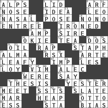 ACROSS 1. High mountains 5. Hat (slang) 8. Sandy's bark 11. Characteristic smell of wine 12. The main thing one is thinking about 14. Lion 15. Rhinal 17. Airs 18. Words to Nanette 19. Main course 21. Pressed 23. Electrical Unit 25. Title for a man of rank and authority 26. Migrant worker of the '30s 27. Beverage made from leaves 28. Two (Sp.) 31. Lubricate 33. Hit sharply and swiftly 35. Staphylococcus 37. _ mater 38. Acura sports coupe 40. Johnson of "Laugh-In" 41. Like summer trees 43. Naughty child 45. French article 46. Myrna of the movies 47. Zeal 50. Actor Baldwin 52. Past tense of be (plural) 53. Declare 54. College paper 56. Last 61. Confront 62. Fast planes 65. Schedule 66. Make imperfect 67. Pile 68. Von Bismarck 69. Double-curved letter 70. R.R. building 71. Prejudice DOWN 1. Queen of England 1702-14 2. Grant temporary use of 3. Inconspicuous attention getter 4. Wither 5. Mouth edge 6. Wedding promise 7. Cease 8. Medicinal plant 9. Tear apart 10. Egg _ yung 13. Nest on high 16. Path through which fluid escapes 18. Compass dir. 20. Independent ruler or chieftain 22. Mouths or openings 24. Lightbulb-shaped fruit 26. Norwegian king 28. Have the gumption 29. Chooses 30. A female animal or person 31. Margarine 32. "If ____ say so..." 34. Air pressure measure (abbr.) 36. Baby powder 37. Everything 39. Dec. holiday 42. Jacques Cousteau's middle name 44. Shaw product 48. From or relating to Ireland 49. Makes clutter 51. Snake ____ (dice throw) 52. Dripping 54. Afternoon social gatherings 55. Possessive pronoun 57. Messy guy 58. Jacques of French films 59. Singer James 60. Vintage cars 61. Madame (abbr.) 63. Make lace 64. Health resort