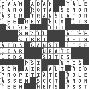 ACROSS 1. "Terrible" tsar 5. First of billions? 9. Falsehood 13. Pacific island yam 14. Roll call or roster of names 15. Sir (Sp.) 16. SW Saudi Arabia district 17. Interpreter 19. Area sheltered from the wind 20. Marina Del _, California 21. Environmental prefix 22. ___ a Wonderful Life 23. _ gin 25. Teat (slang) 26. Slow-paced one 30. Toward shelter 34. High-altitude cloud 35. Stakes 36. Opera by Verdi 39. 2nd pers. sing. pres. of can (arch.) 42. Louse (plural) 43. One who doesn't tell the truth 44. A salt of uric acid 46. Hats (slang) 47. Settings 48. Air pressure measure (abbr.) 51. Nuclear Threat Initiatives 54. Elected rep. 57. Atmosphere 58. Keyboard modifier key 60. To free from 62. Appease 65. Hero or heavy, e.g. 66. NE Netherlands city 67. Highlander 68. Soon (poet.) 69. Adolescent 70. Cloth borders 71. Inconspicuous attention getter DOWN 1. Slanted text style (abbr.) 2. Flower holders 3. Satellite of Uranus 4. Or not 5. Johnson of "Laugh-In" 6. Dinghy 7. "One Day ___ Time" 8. French painter Edouard 9. Beverage made from leaves 10. Against 11. Spoils 12. Blunders 15. Narrow, elongated depression 18. _-fi 20. Painter Guido (1575-1642) 24. Motion picture awards 27. Curve 28. Lyricist Gershwin 29. "_ and Lucy" (Charlie Brown theme song) 30. Most capable 31. Luau accessory 32. And so on (abbr.) 33. Compass dir. 36. Everything 37. One more than two 38. June honoree 40. Indian title of respect (Mr.) 41. Make lace 45. Portable shelter 48. Ache 49. Be seated 50. From or relating to Ireland 52. Removes the wrinkles 53. Grain storage towers 54. Petty quarrel 55. Celtic language 56. Olfactory organ 58. Smallest unit of an element 59. Allows 61. Scratch 63. Fenced enclosure 64. Adept person 65. Strike