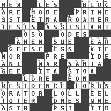 ACROSS 1. ___ Haven, CT 4. French article 7. Alliance 11. "We ___ not amused" (Victoria) 12. Method 13. A-one 14. Fast jet (abbr.) 15. Inactive volcano in Sicily 16. Nomad 17. Trials 19. Helper 21. Bear (Spanish) 23. Lyric poems 24. So be it 25. Take to court 26. Ewer handle 29. Honkers 30. Double-curved letter 31. Compete 32. And not 33. Before (prefix) 34. Binary compound 35. Black tropical American cuckoo 36. Armed conflict 37. Before Barbara or Clara 40. Turn to the right 41. Call ___ day 42. Portico 43. Old wives' tales, e.g. 45. Period of immesurable duration 46. Home 51. Nobles 55. Speaker 56. Hang loosely or laxly 58. Snakelike fish 59. Carrier 60. Singles 61. Compass dir. 62. SW Saudi Arabia district 63. 23rd letter of the Greek alphabet 64. It would DOWN 1. Political cartoonist Thomas 2. Celtic language 3. Moistens 4. Car dealer's back yard 5. Pulitzer Prize-winning author Ferber 6. Oceans 7. Naughty children 8. Pale green bean 9. Presage 10. Certainty 12. Makes clutter 13. Introduce or present, as a question 16. Amusement-park features 18. Heavy book 20. Boozer 22. Single 24. Nest on high 25. Father Junipero _ 26. Webber/Rice musical 27. Opera by Verdi 28. Portuguese money of account (variant) 29. Went 32. Tired old horse 33. Eucharist need 36. One who wires 37. Compass dir. 38. Ringlike coral islands and reefs 39. Words to Nanette 43. 61 cubic inches 44. Scent 46. Roll call or roster of names 47. Greek god of love 48. Suttee (variant) 49. Hoof sound 50. Immeasurably long periods of time 52. Painter Guido (1575-1642) 53. Gouge 54. Downhill vehicle 57. Flowery wreath