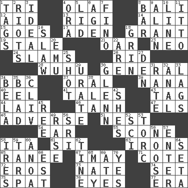 ACROSS 1. Three (prefix) 4. Norwegian king 8. Indonesian resort city 12. Help 13. Swiss mountan, "Queen of the Mountains" 14. Set down 15. Moves 17. Arabian gulf 18. Monetary aid 19. Showing deterioration from age 21. Boat paddle 23. Modern: prefix 24. Hits or strikes with great force 26. To free from 28. Chinese city south-southwest of Nanjing 30. Commissioned military rank 34. English channel? 37. Taken by mouth 39. Grandmother 40. Snakelike fish 41. Stories 43. Label 44. Den 46. Hyperbolic tangent 47. Raised railways 48. Contrary to your interests or welfare 51. A home for chicks 54. Ewer handle 55. Biscuitlike quick bread 58. Call ___ day 61. Be seated 63. Removes the wrinkles 65. Indian princess (variant) 67. "If ____ say so..." 71. ____ d'Azur (French Riviera) 72. Greek god of love 73. Nathan's nickname 74. Arrange properly for use 75. Argument over a trivial matter 76. Sight organs 77. Period DOWN 1. Labels 2. Disturbances 3. Standard of perfection 4. Mouth or opening 5. Flaplike covering 6. Ripen 7. A pale, very dry sherry 8. Drinking establishment 9. Actor Alda or Thicke 10. Actor's bit 11. "Tell ____ the Marines!" 16. Cole _ (cabbage dish) 18. Broad smile 20. Australian flightless bird 22. "We ___ not amused" (Victoria) 25. Went for two points 27. Lair 29. A salt of uric acid 30. American astronaut and politician John 31. Pace 32. Of or related to the anus 33. Fails to keep up a pace 34. Actor Lugosi 35. Necklace unit 36. 154 in Roman numerals 38. In the manner of 42. "______ My Girl" (Turtles hit) 45. To separate or throw off 49. To erase 50. _ Lanka 52. _-fi 53. Torque (variant) 56. Trap for birds or small mammals 57. Keyboard key 58. Angers 59. Canvas cover 60. Small Philippine buffalo 62. Prong on a fork 64. Bristle 66. Eastern Standard Time (abbr.) 68. Can I? 69. Had dinner 70. It is so
