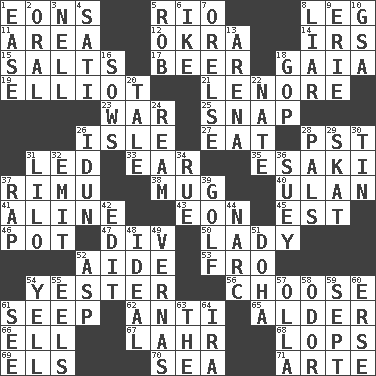 ACROSS 1. Immeasurably long periods of time 5. _ de Janeiro 8. Part of a journey 11. Type of rug 12. Gumbo ingredient 14. Big collection agency 15. Table seasonings 17. Fermented drink made from hops 18. Greek goddess of the earth (variant) 19. American author Paul (1891-1958) 21. Poe poem 23. Armed conflict 25. Fastener 26. Capri or Wight 27. Consume 28. Pacific Standard Time (abbr.) 31. Directed 33. Ewer handle 35. 1973 Nobel Price Winner (Physics) Leo 37. Tall New Zealand timber tree 38. Large cup 40. Uhlan (variant) 41. Place in a line 43. A really long time 45. Eastern Standard Time (abbr.) 46. Cooking vessel 47. HTML Container Element 50. Kenny Rogers chart-topper in '80 52. Assistant 53. Back 54. Last past 56. Opt 61. Ooze 62. Opposed to 65. Tree or shrub in the Birch family 66. Pipe bend 67. Cowardly lion portrayer 68. Chops off 69. Raised railways 70. Ocean 71. Johnson of "Laugh-In" DOWN 1. Comfort 2. Of the mouth 3. 1994 drama film starring Jodie Foster 4. Suttee (variant) 5. Director Reiner 6. D.D.E's nickname 7. Threatening words 8. One who doesn't tell the truth 9. One of the Great Lakes 10. Girls' org. (abbr.) 13. Sports stadium 16. Sty mamas 18. Republican Party 20. Falsehood 22. Nathan's nickname 24. 480, 500 or 516 sheets of paper 26. Goddess of spring and wife of Bragi 28. Friends 29. Three-handed card game 30. Shallow baking pan 31. _ and Stitch 32. Give off 34. Regret 36. Chop _ 37. Reproach for some lapse or misdeed 39. Eighteen holes 42. Prepare for publication 44. Drug cop 48. Standard of perfection 49. Actresses Bloom and Felton 51. Capital of the state of Qatar 52. Viper 54. Shout 55. Snakelike fish 57. Water jar 58. Aroma 59. Back-to-school mo. 60. Celtic language 61. Observe 63. Definite Article 64. Retirement account (abbr.)