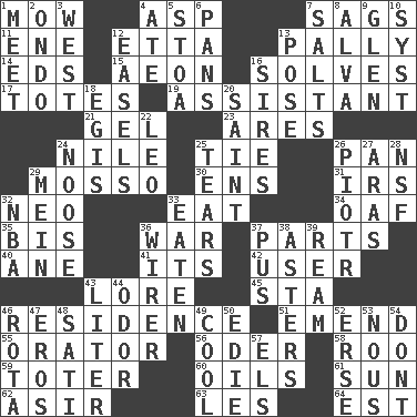 ACROSS 1. Cut the grass 4. Viper 7. Settles 11. Compass dir. 12. Singer James 13. Friendly 14. Begley and Asner 15. Age 16. Finds the solution 17. Lugs 19. Aide 21. Set 23. Ancient Greek god of war 24. The longest river in the world 25. Make a knot 26. Baking dish 29. With motion or animation 30. Followers of ems 31. Big collection agency 32. Modern: prefix 33. Erode 34. Clumsy lout 35. Twice 36. Armed conflict 37. Components 40. One (Scot) 41. It is 42. One who uses or employs something 43. Old wives' tales, e.g. 45. R.R. building 46. Dwelling 51. Make improvements or corrections to 55. Speaker 56. Baltic tributary 58. Friend of Pooh 59. Carrier 60. Lubricates 61. Player for Phoenix 62. SW Saudi Arabia district 63. French article 64. Eastern Standard Time (abbr.) DOWN 1. Rendezvous 2. Southwest Nigerian state 3. Compass direction 4. Had dinner 5. Portico 6. Baking dishes 7. Table seasonings 8. Inventor's middle name 9. Small, secluded valley 10. System (abbr.) 12. Artist's stands 13. Introduce or present, as a question 16. Titles for men of rank and authority 18. Armor plate that protects the chest 20. Virtuous person 22. Lion 24. Trap for birds or small mammals 25. Lacerates 26. Peter (Polish) 27. Caspian sea tributary 28. Overdraft (abbr.) 29. Chow _ 32. Basketball assoc. 33. Ingested 36. One who wires 37. Fluid product of inflammation 38. Michaelmas daisies 39. 480, 500 or 516 sheets of paper 43. 61 cubic inches 44. Aroma 46. Round or rotation of duties 47. Greek god of love 48. Suttee (variant) 49. Calm and collected 50. Singer Brickell 52. Celtic language 53. Horse sense 54. Do not 57. Raised railways