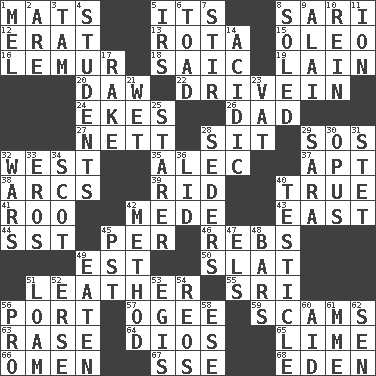 ACROSS 1. Floor coverings 5. ___ a Wonderful Life 8. Indian skirt 12. Part of Q.E.F. 13. Round or rotation of duties 15. Margarine 16. Arboreal primate 18. Ketch in the Levant 19. (Had) reclined 20. Fool 22. Popular '50s hangout 24. Supplements with great effort 26. June honoree 27. Remaining after all deductions 28. Be seated 29. Distress signal 32. Compass direction 35. Actor Baldwin 37. Fitting 38. Curves 39. To free from 40. Loyal 41. Friend of Pooh 42. Ancient Persian 43. 90 degrees 44. Fast jet (abbr.) 45. For each 46. Confederate soldiers (slang) 49. Eastern Standard Time (abbr.) 50. Narrow board 51. Cordwainer's material 55. Indian title of respect (Mr.) 56. Sweet dark-red dessert wine 57. Double curve, resembling the letter S 59. Fraudulent business schemes 63. To erase 64. "Vaya con ____" 65. Welles in "The Third Man" 66. Presage 67. Compass dir. 68. Paradise DOWN 1. Cartoonist voice _ Blanc 2. "We ___ not amused" (Victoria) 3. Scottish cap 4. SAT takers 5. Big collection agency 6. Frog relative 7. Use a spoon 8. Having a sole or soles 9. Mountain range southwest of Kyrgyzstan 10. It's straight from the horse's mouth 11. Electrically charged atom 14. Being or containing an acid 17. Immoral or dissolute person 21. Soggy 23. Large container 25. A viewer who gazes fixedly 28. Spring feasts 29. "Two Mules for Sister ____" 30. Musical composition 31. Proofreading order 32. Armed conflicts 33. Greek god of love 34. Highlander 36. Hat (slang) 40. A testis 42. Mode 45. Pacific Standard Time (abbr.) 47. Raised railways 48. Oblong pieces of solid material 49. Ingested 51. Rich soil 52. Celtic language 53. Armor plate that protects the chest 54. Vintage cars 56. Adept person 58. Compass dir. 60. Assist 61. Madame (abbr.) 62. Elected rep.