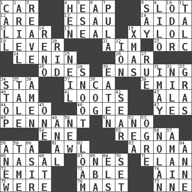 ACROSS 1. Automobile 4. Pile 8. Narrow opening 12. "We ___ not amused" (Victoria) 13. He sold his birthright 14. Opera by Verdi 15. One who doesn't tell the truth 17. Be tempered by heat 18. Xylene (variant) 19. Prying instrument 21. Direct toward a target or goal 23. The grampus (Milton) 24. Soviet premier 1918-24 26. Rowing implement 28. Lyric poems 30. Following as a consequence or result 34. R.R. building 37. South American Indian 39. Arab leader 40. Scottish cap 41. Plunders 43. Chicken ___ king 44. Margarine 46. Double curve, resembling the letter S 47. It is so 48. Pre-World Series prize 51. Billionth: prefix 54. Compass dir. 55. Canadian anthropologist Darnell 58. _ moment's notice (2 wds.) 61. Leather borer 63. Scent 65. Relating to the nose 67. Washington bills 71. Enthusiasm 72. Send forth 73. Competent 74. The 18th letter of the Arabic alphabet 75. Past tense of be (plural) 76. Vertical spar for supporting sails 77. Compass dir. DOWN 1. Give a ring to 2. Satellite of Uranus 3. Break or tear apart 4. Layer 5. Compass dir. 6. Auto club (abbr.) 7. Monetary unit of Botswana 8. Declare 9. _ and Stitch 10. Scent 11. Baby powder 16. Former U.S. Attorney General Janet 18. Dec. holiday 20. To free from 22. Electrically charged atom 25. Famous astronaut Armstrong 27. Regret 29. Snout, nose 30. Ingested 31. "If ____ say so..." 32. Mediterranean tributary 33. Pate de foie ____ 34. Cease 35. Falsehood 36. So be it 38. Gear tooth 42. Shrivel 45. Single 49. Of or related to the anus 50. ___ Haven, CT 52. Teachers' org. 53. Legendary monster 56. Pitcher Ryan 57. With great haste 58. Afresh 59. Docile 60. SW Saudi Arabia district 62. Rich soil 64. Queen of England 1702-14 66. Had dinner 68. Basketball assoc. 69. Raised railways 70. Put into a specified state