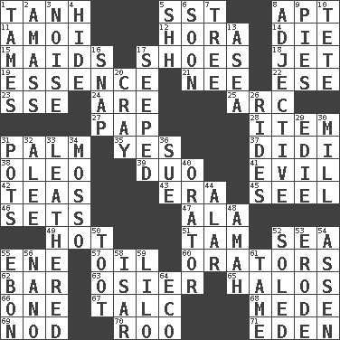 ACROSS 1. Hyperbolic tangent 5. Fast jet (abbr.) 8. Fitting 11. Mine, in Marseilles 12. Israeli folk dance 14. Expire 15. Unmarried girls 17. Imelda's hoard 18. Type of plane 19. Core 21. Born 22. Compass dir. 23. Compass dir. 24. "We ___ not amused" (Victoria) 25. Curve 27. Infant food 28. A whole individual unit 31. Inside of hand 35. It is so 37. "You Light Up My Life" star Conn 38. Margarine 39. Superhero pair 41. Tending to cause great harm 42. Beverages made from leaves 43. Period 45. Sew up the eyelids of hawks and falcons 46. Puts into a specified state 47. In the manner of 49. Being at a high temperature 51. Scottish cap 52. Ocean 55. Compass dir. 57. Petroleum 60. Speakers 62. Tavern 63. Flexible twig of a willow tree 65. Saint headwear 66. Single 67. Baby powder 68. Ancient Persian 69. Dreamland 70. Friend of Pooh 71. Paradise DOWN 1. Corrects by punishment or discipline 2. Collect or gather 3. Annoying sound 4. Flintstone garb 5. Quiet! 6. Within a short period 7. Family _ (genealogy) 8. Descriptive word 9. Sliced desserts 10. False hair 13. Toward the sea 16. Fastener 17. Oozed 20. Supercomputer manufacturer 26. Amusement-park features 29. Singer Brickell 30. Place where flour is made 31. Plant holders 32. Toward shelter 33. Resembling or made to resemble leather 34. With motion or animation 36. Institute legal proceedings 40. Speaker 44. Having or resembling wings 48. Wet nurse 50. A blast of a horn 52. Having a sole or soles 53. Eat (away) 54. NE Netherlands city 55. Inky black, to poets 56. Billionth: prefix 58. Austrian river, tributary to the Danube 59. _ and Stitch 61. Docile 64. Environmental prefix