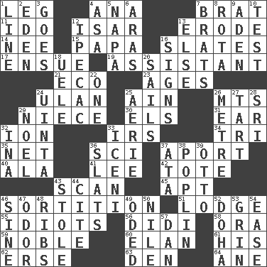 ACROSS 1. Part of a journey 4. Santa ___, CA 7. Naughty child 11. Wedding promise 12. Austrian river, tributary to the Danube 13. Wear away 14. Born 15. Dad 16. Chalkboards 17. Take place subsequently 19. Helper 21. Environmental prefix 23. Ripens 24. ____ Bator, Mongolia 25. The 18th letter of the Arabic alphabet 26. Mountains (abbr.) 29. Sibling's daughter 30. Raised railways 31. Ewer handle 32. Electrically charged atom 33. Big collection agency 34. Three (prefix) 35. Fish or hair follower 36. _-fi 37. To the left, to Queeg 40. Wing 41. Area sheltered from the wind 42. Carryall 43. Glance over 45. Fitting 46. Determination 51. Inn 55. Foolish or stupid persons 56. "You Light Up My Life" star Conn 58. Mouth or opening 59. Impressive in appearance 60. Liveliness 61. Part of HMS, perhaps 62. Celtic language 63. Lair 64. A saturated hydrocarbon DOWN 1. Actor's bit 2. Genesis locale 3. Moves 4. White ___ sheet 5. California wine valley 6. Caspian sea tributary 7. Naughty children 8. Round or rotation of duties 9. An important port of Yemen 10. Trial 12. Medicinal drug used to evoke vomiting 13. Otherwise 16. Attaches a signature 18. Ubangi River tributary 20. Moves on water 22. Single 24. National forest in Provo, Utah 25. Nest on high 26. Distance measurement (Brit.) 27. Small pie 28. _ Lanka 29. Christmas carol 32. _ tizzy (2 wds.) 33. Ancient Celtic tribe of eastern Britain 36. Narrow boards 37. "One Day ___ Time" 38. Cotton for raincoats, e.g. 39. Von Bismarck 43. Took without asking 44. Quote 46. Trig term 47. Scent 48. Teases 49. Wrote a lyric poem 50. The longest river in the world 52. Capital of the state of Qatar 53. Amused look 54. Comfort 57. Daniel's nick name