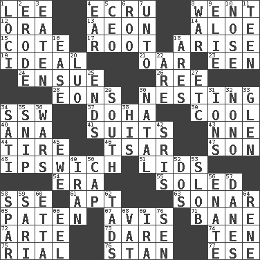 ACROSS 1. Area sheltered from the wind 4. Shade of tan 8. Left 12. Mouth or opening 13. Age 14. _ vera 15. ____ d'Azur (French Riviera) 17. Carrot, for example 18. Ascend 19. Perfect 21. Boat paddle 23. Car or cant ending 24. Follow as a consequence or result 26. To separate or throw off 28. Immeasurably long periods of time 30. Nestling 34. Compass dir. 37. Capital of the state of Qatar 39. Calm and collected 40. Santa ___, CA 41. Sets or collections 43. Compass dir. 44. Become fatigued 46. Russian ruler of old 47. Boy, to dad 48. NE Massachusetts town 51. Flaplike coverings 54. Period 55. Having a sole or soles 58. Compass dir. 61. Fitting 63. Underwater navigation system 65. Eucharist need 67. Advice 71. Object of repulsion 72. Johnson of "Laugh-In" 73. Have the gumption 74. "___ Little Indians" 75. Monetary unit of Yemen 76. Comedian Laurel of Laurel & Hardy 77. Compass dir. DOWN 1. Locales 2. Wear away 3. Consumed 4. Ewer handle 5. Corporate head (abbr.) 6. Friend of Pooh 7. To (old English) 8. Armed conflict 9. Writer Wiesel 10. Sense of smell 11. Adolescent 16. Relaxation 18. Ancient Greek god of war 20. Nilotic language 22. "We ___ not amused" (Victoria) 25. Conclusions 27. And so on (abbr.) 29. _ pole 30. Brizilian seaport 31. Charged particles 32. Words to Nanette 33. Small, secluded valley 34. Suttee (variant) 35. Clip 36. Armed conflicts 38. Part of HMS, perhaps 42. Indian titles of respect 45. She-sheep 49. SW Asia republic 50. Head covering 52. Two (Sp.) 53. Oscar Madison type 56. Maternal 57. Natives or inhabitants of Denmark 58. Practice fight 59. Indian skirt 60. Singer James 62. Bits 64. French philosopher Descartes 66. Snakelike fish 68. Large container 69. Retirement account (abbr.) 70. Elected rep.