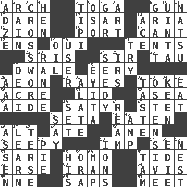 ACROSS 1. Bowlike part 5. Ancient Roman robe 9. Chewing product 12. Have the gumption 13. Austrian river, tributary to the Danube 14. Operatic vocal solo 15. The Jewish people; Israel 16. Left side of a ship or aircraft 17. Patter 18. Followers of ems 19. Fr. "Yes" 21. Portable shelters 22. Indian titles of respect 24. Title for a knight 26. The 19th letter of the Greek alphabet 27. A sleeping potion; an opiate (poet.) 28. Suggestive of the supernatural 29. Period of immesurable duration 30. All-night dance parties 32. Casino tip 36. 43,560 square feet 37. Hat (slang) 38. Toward the sea 39. Helper 40. Letch 42. Proofreading order 43. Stalk of a moss capsule 44. Eroded 46. The first octave above the treble staff 49. Had dinner 50. So be it 51. Oozy 53. Naughty child 54. Elected rep. 57. Indian skirt 58. Like (prefix) 61. Periodic rise and fall of the sea level 62. Celtic language 63. SW Asia republic 64. Advice 65. Compass dir. 66. Plant excrements 67. Confront DOWN 1. Edge tool used to cut and shape wood 2. Water falling in drops from the sky 3. What you're doing now 4. Layer 5. Native american tent (variation) 6. Bear (Spanish) 7. Slender fish 8. Tate display 9. Let have 10. National forest in Provo, Utah 11. Taiwanese island in East China Sea 14. Adept person 19. Lubricate 20. One who makes use of a thing 21. Attempt 23. The wife of a rajah (variant) 24. Morally degraded 25. Big collection agency 27. Tenth: prefix 28. Webber/Rice musical 29. Auto club (abbr.) 31. Having winglike extensions 32. Clothes sense 33. Clearly or manifestly demonstrative 34. Peachy ____! 35. Ingest 40. Arrange properly for use 41. 480, 500 or 516 sheets of paper 43. Declare 45. Electrical Unit 46. NE Netherlands city 47. Memorize 48. Laconic 52. Sliced dessert 53. Charged particles 55. Singer Brickell 56. A home for chicks 58. Part of HMS, perhaps 59. Mouth or opening 60. Atlas unit 61. Scottish cap