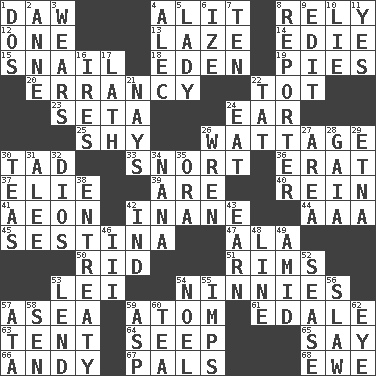ACROSS 1. Obsolete 4. Set down 8. Trust 12. Single 13. Goldbrick 14. Singer Brickell 15. Slow-paced one 18. Locale of original sin 19. Sliced desserts 20. Tendancy to err 22. Small child 23. Bristle 24. Hearing organ 25. Like a shrinking violet 26. Electrical Measurement 30. Bit 33. Derisive sound 36. Part of Q.E.F. 37. Writer Wiesel 39. "We ___ not amused" (Victoria) 40. It's straight from the horse's mouth 41. Age 42. Silly 44. American Automobile Association (abbr.) 45. French poetic form 47. Chicken ___ king 50. To free from 51. Basketball hoops 53. Luau accessory 54. Simpletons 57. At sea 59. Smallest unit of an element 61. Peak District village in England 63. Portable shelter 64. Ooze 65. Declare 66. Actor Griffith 67. Friends 68. She-sheep DOWN 1. Two (Sp.) 2. Queen of England 1702-14 3. Puts on (as clothing) 4. Actor Baldwin 5. Kenny Rogers chart-topper in '80 6. Ending with capital 7. Nine, plus one 8. Newsperson 9. Prepare for publication 10. Falsehood 11. Affirmative reply 16. Angers 17. Thin strip of wood or metal 21. Negative votes 22. Make lace 24. Ingest 26. Songbird 27. Type of rug 28. Greek goddess of the earth (variant) 29. Inactive volcano in Sicily 30. Afternoon social gatherings 31. Toward shelter 32. "Vaya con ____" 34. Nanny 35. Mouth or opening 38. Plea 42. Indiana (abbr.) 43. Merit 46. One more than two 48. Actor's bit 49. Among 52. Gospel singer Marvin 53. Grant temporary use of 54. Christmas carol 55. Naughty children 56. Cole _ (cabbage dish) 57. "One Day ___ Time" 58. Elected rep. 59. Viper 60. Beverage made from leaves 62. Sight organ