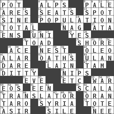 ACROSS 1. Plant holder 4. High mountains 8. Light colored 12. Ancient Greek god of war 14. Theater features 16. Blemish 17. Trig term 18. Census information 20. "_____ Recall" 22. Tired old horse 23. "One Day ___ Time" 24. Followers of ems 25. University (slang) 28. Affirmative reply 30. Frog relative 31. Dinah or Pauly 35. Adept person 37. A home for chicks 40. Margarine 41. Having or resembling wings 42. Expletives 44. ____ Bator 45. Have the gumption 46. (Had) reclined 47. Scottish cap 48. Simple song 50. Pinches, bites 52. Night before a holiday 54. And so on (abbr.) 55. Armed conflict 58. Greek goddess of the dawn 61. Car or cant ending 63. Any of the three canals of the cochlea 65. Interpreter 70. NW Algerian seaport 71. Edible starchy tuberous root 72. Damascus' land 73. Haul 74. SW Saudi Arabia district 75. Drop; flow; fall 76. Born DOWN 1. Thick mixture 2. Greek mythologigal hunter 3. Portable shelters 4. Viper 5. Lion 6. Infant food 7. Make senseless or dizzy 8. Pacific Standard Time (abbr.) 9. Capital of Western Samoa 10. Spoils 11. Inactive volcano in Sicily 13. Ocean 15. Kill 19. Eras 21. Nilotic language 26. Billionth: prefix 27. Standard of perfection 29. Yells 30. Cigar-shaped 32. Spanish pot 33. 480, 500 or 516 sheets of paper 34. A really long time 35. Jai _ 36. Draw slowly or heavily 38. R.R. building 39. One or ones belonging to thee 41. Find the sum of 43. In a ____ (agitated or irritated) 49. Jacques Cousteau's middle name 51. Personal Computers (abbr.) 53. Snakelike fish 55. Make _____ (do battle with) 56. Having winglike extensions 57. Indian princess (variant) 58. Singer James 59. Mouths or openings 60. Indian skirt 62. Negative votes 64. Small bed 66. And not 67. Three (prefix) 68. Lubricate 69. Actress Charlotte
