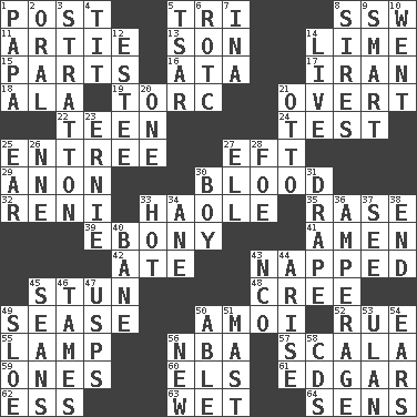 ACROSS 1. Mail 5. Three (prefix) 8. Compass dir. 11. Nick name for Arthur 13. Manchild 14. Welles in "The Third Man" 15. Components 16. _ moment's notice (2 wds.) 17. SW Asia republic 18. According to 19. Torque (variant) 21. Unconcealed 22. Adolescent 24. Trial 25. Main course 27. Newt 29. At once, immediately (arch.) 30. Vital fluid 32. Painter Guido (1575-1642) 33. White Person, in Hawaii 35. To erase 39. Black 41. So be it 42. Had dinner 43. Slept 45. Astound 48. Algonquian 49. Gospel singer Marvin 50. Mine, in Marseilles 52. Regret 55. Desk light 56. Basketball assoc. 57. Any of the three canals of the cochlea 59. Singles 60. Raised railways 61. _ Allan Poe 62. Curvy letter 63. Dripping 64. Elected reps. DOWN 1. Dad 2. Of the mouth 3. Ski resort town in Vermont 4. Teat (slang) 5. Russian ruler of old 6. College mil. group 7. _ tizzy (2 wds.) 8. Titles for men of rank and authority 9. Don Adams' spy role 10. Gone 12. First name in cosmetics 14. Moving, as bait 20. Single 21. Von Bismarck 23. Bert's buddy 25. Hearing organ 26. Compass dir. 27. Pipe bend 28. Enemy 30. Male child 31. Window treatment 33. Being at a high temperature 34. A saturated hydrocarbon 36. Electrical Measurement 37. Observe 38. Conclusion 40. Object of repulsion 43. Non-commissioned officer (abbr.) 44. Originate 45. Seines 46. Softens 47. United States Postal Service (abbr.) 49. A type of plum 50. Competent 51. Vertical spar for supporting sails 53. Uhlan (variant) 54. Hearing organs 56. ___ Haven, CT 58. Music discs