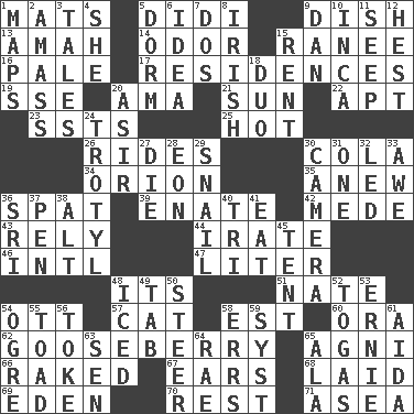 ACROSS 1. Floor protectors 5. "You Light Up My Life" star Conn 9. Food container 13. Nanny 14. Scent 15. Indian princess (variant) 16. Light colored 17. Dwellings 19. Compass dir. 20. Housemaid (var.) 21. Player for Phoenix 22. Fitting 23. Fast planes 25. Being at a high temperature 26. Amusement-park features 30. Root beer relative 34. Greek mythologigal hunter 35. Afresh 36. Petty quarrel 39. Maternal 42. Ancient Persian 43. Have confidence or faith in 44. Feeling or showing extreme anger 46. International (abbr.) 47. 61 cubic inches 48. ___ a Wonderful Life 51. Nathan's nickname 54. Baseball player Mel 57. Domesticated feline 58. Eastern Standard Time (abbr.) 60. Mouth or opening 62. Sour, prickly fruit 65. Hindu god of fire 66. Moved through 67. Hearing organs 68. Put down 69. Genesis locale 70. State of inaction 71. At sea DOWN 1. Atlas contents 2. Collect or gather 3. Stories 4. A female animal or person 5. Dormintory (informal) 6. The main thing one is thinking about 7. Two (Sp.) 8. From or relating to Ireland 9. Daniel's nick name 10. South American Indian 11. Ooze 12. Behest 15. Monthly bill 18. Superhero pair 20. SW Saudi Arabia district 24. Trinitrotoluene 27. Expire 28. Age 29. Slow-paced one 30. Device for capturing images 31. Single 32. Directed 33. Deep reverence 36. Indian title of respect (Mr.) 37. Fenced enclosure 38. Keyboard modifier key 40. Three (prefix) 41. Erode 45. Portable shelter 48. On the rocks 49. Bar bill 50. Navigate 52. Ancient Roman robes 53. Bert's buddy 54. Legendary monster 55. Frog relative 56. Puff or smoke 58. Blunders 59. System (abbr.) 61. Opera by Verdi 63. Elected rep. 64. Actress Charlotte 65. In the manner of