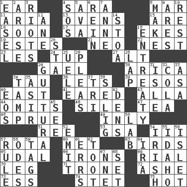 ACROSS 1. Ewer handle 4. "Two Mules for Sister ____" 8. Third mo. 11. Roberta Peters solo 13. Baking chambers 15. "We ___ not amused" (Victoria) 16. Within a short period 17. Virtuous person 18. Makes supply last 19. _____ Park, CO 21. Modern: prefix 22. A home for chicks 23. French article 24. Uncastrated adult male sheep 27. Keyboard modifier key 29. Highlander 30. N. Chile seaport 34. The 19th letter of the Greek alphabet 36. Allows 39. Mexican monetary units 40. 90 degrees 41. Having ears or earlike features 43. Silent film actress Nazimova 44. Leaves out 46. Drop; flow; fall 47. Afternoon social gathering 48. Upset 49. Inwardly 51. Portuguese money of account (variant) 53. Girls' org. (abbr.) 54. One more than two 57. Roll call or roster of names 60. Was introduced to 63. Avian creatures 65. Hereditary estate 66. Removes the wrinkles 69. Monetary unit of Yemen 70. Part of a journey 71. Marketplace scale 72. American tennis player Robert 73. Curvy letter 74. Proofreading order 75. Being at a high temperature DOWN 1. Artist's stand 2. Came up 3. Disturbances 4. Mayday 5. Actress Gardner 6. It's straight from the horse's mouth 7. Queen of England 1702-14 8. Create 9. Ancient Greek god of war 10. Take ten 12. A saturated hydrocarbon 14. Portico 18. Plea 20. R.R. building 25. Ubangi River tributary 26. Entreaties 28. Pet locale 29. From the throat 31. Small island 32. Root beer relative 33. White ___ sheet 34. Pack (down) 35. SW Saudi Arabia district 37. Three (prefix) 38. Former Milwaukee Brewers owner Bud 40. Greek goddess of the dawn 42. Lairs 45. Observe 50. Experiment locale 52. Give off 54. From or relating to Ireland 55. Potato state 56. Small island 57. Governing power 58. Lyric poems 59. Labels 61. Blunders 62. A blast of a horn 64. Retirement account (abbr.) 67. Compass dir. 68. Arrange properly for use